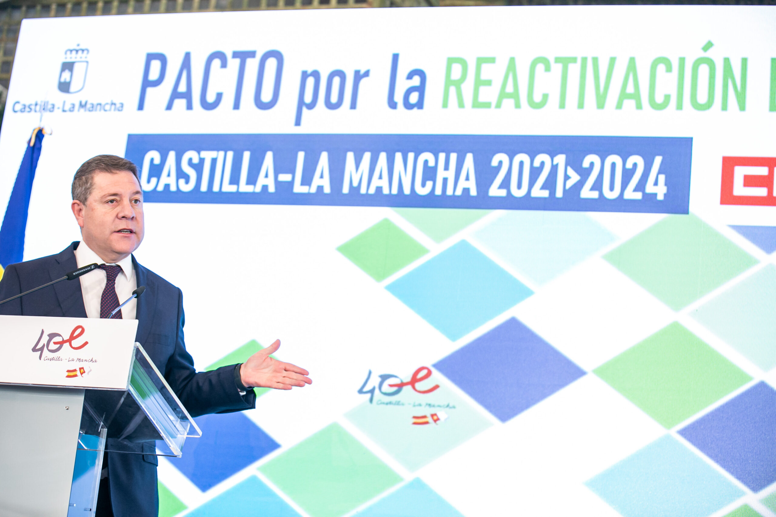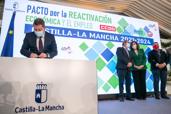 El presidente regional, Emiliano García-Page, ha firmado este miércoles el nuevo Pacto por la Reactivación Económica y el Empleo de Castilla-La Mancha con los responsables regionales de CCOO y UGT, Paco de la Rosa y Luis Manuel Monforte, respectivamente; y el presidente de CECAM, Ángel Nicolás; en presencia del vicepresidente de Castilla-La Mancha, José Luis Martínez Guijarro; la consejera de Economía, Empresas y Empleo, Patricia Franco; y el consejero de Hacienda, Juan Alfonso Molina; además de un centenar de representantes de colectivos y asociaciones participantes en el Pacto.