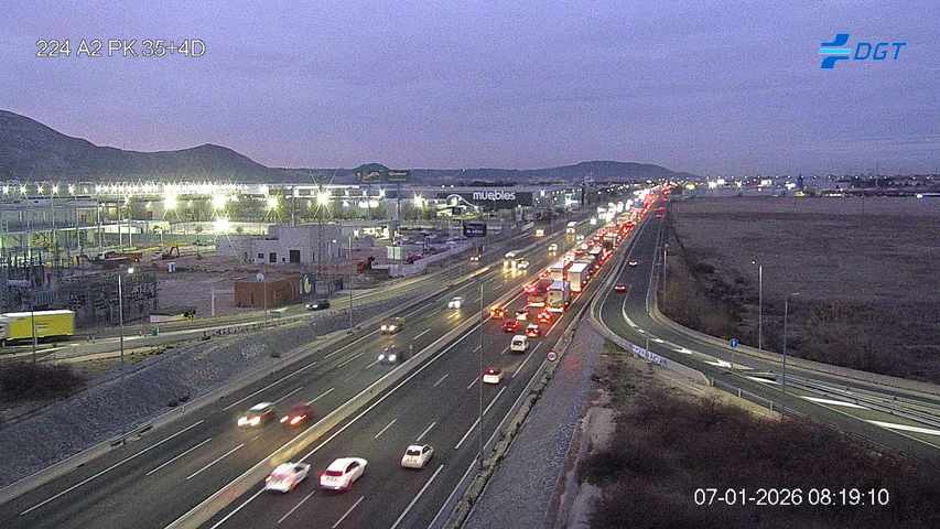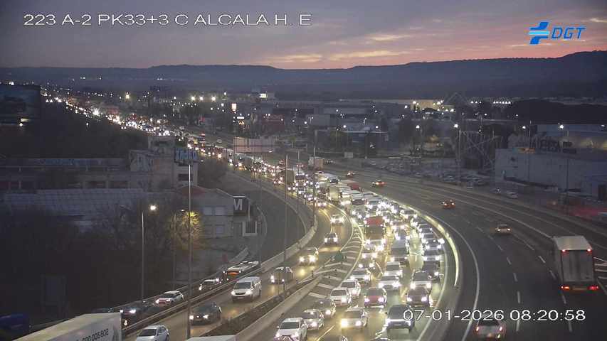 Dos imágenes de las cámaras de la DGT ilustran bien tanto la retención en Alcalá como el punto que alcanzaba a las 8.20, pocos después de Meco: