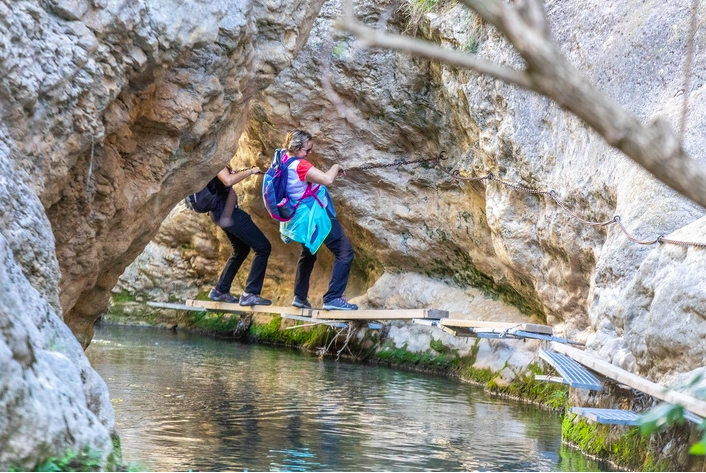 Y si el paisaje escalonado de Ruidera y el equilibrio de sus aguas sorprenden, hay que prepararse para otro milagro de la naturaleza a poco más de dos horas. En plena Sierra del Segura, entre frondosos bosques de pinos, en el Parque natural de los Calares del Mundo y de la Sima, nace el río Mundo que se convertirá en afluente del Segura y aunque su recorrido es interesante, especialmente cuando transcurre entre los llamados Puentes romanos de Isso, sin duda lo que más llama la atención es su sorprendente nacimiento por la abertura de la cueva de los Chorros, de unos 15 metros de ancho y 25 de alto, colgada en mitad de un circo de piedra. El agua sale con fuerza, se precipita al vacío y 82 metros más abajo se estrella contra las rocas, formando un conjunto de cascadas y pozas de extraordinaria belleza envuelto en el vapor del agua que mantiene verdes las paredes cubiertas de musgos y líquenes. El recorrido continúa en forma de pequeñas cascadas y pozas (las llamadas “calderetas”) hasta 300 metros más abajo.