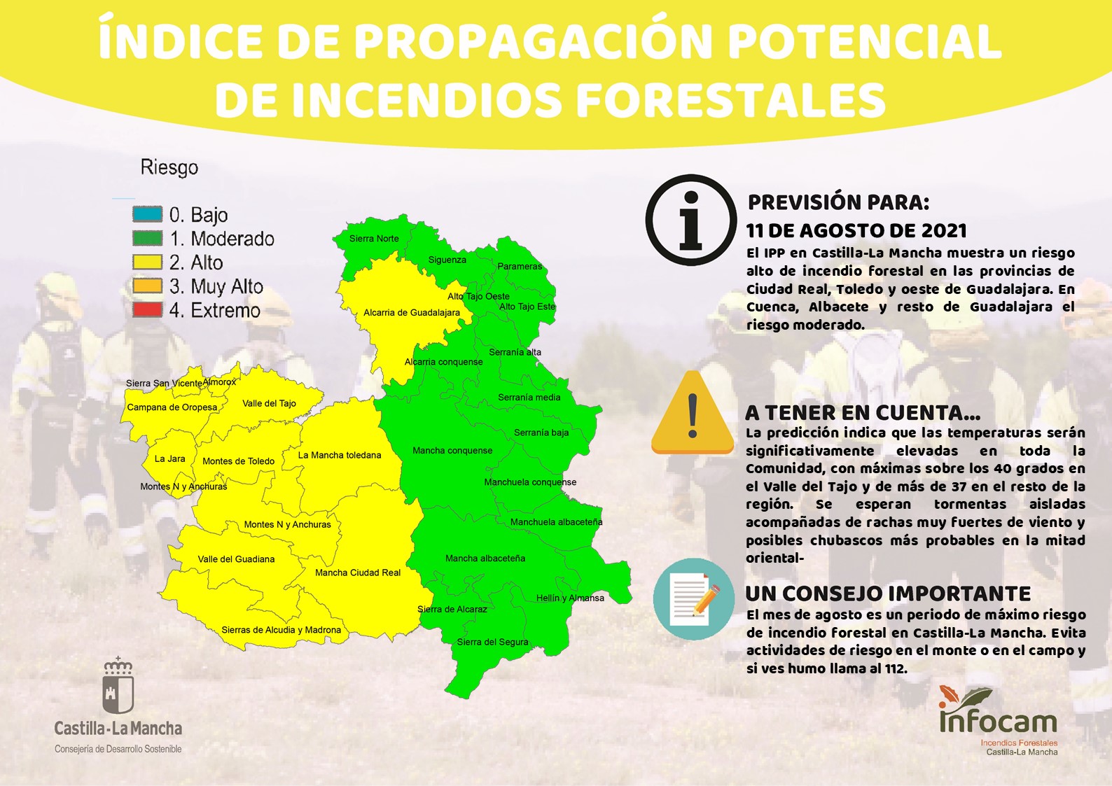 Según la previsión del Infocam, este miércoles media provincia estará en riesgo alto de incendios forestales, ya que es el nivel de prevención que se ha asignado para toda la Alcarria. El resto de las comarcas tienen «riesgo moderado».