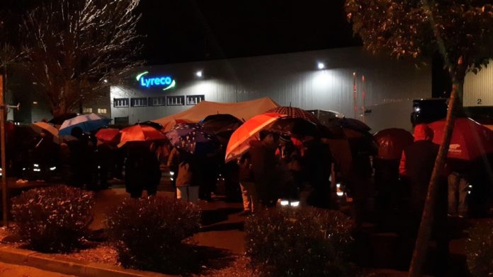 Cerca de 200 personas se sumaron a lo largo de la noche de este viernes a la concentración convocada a las puertas de la planta de la multinacional francesa Lyreco de Alovera para manifestar su apoyo a los trabajadores, en huelga indefinida desde el pasado lunes.