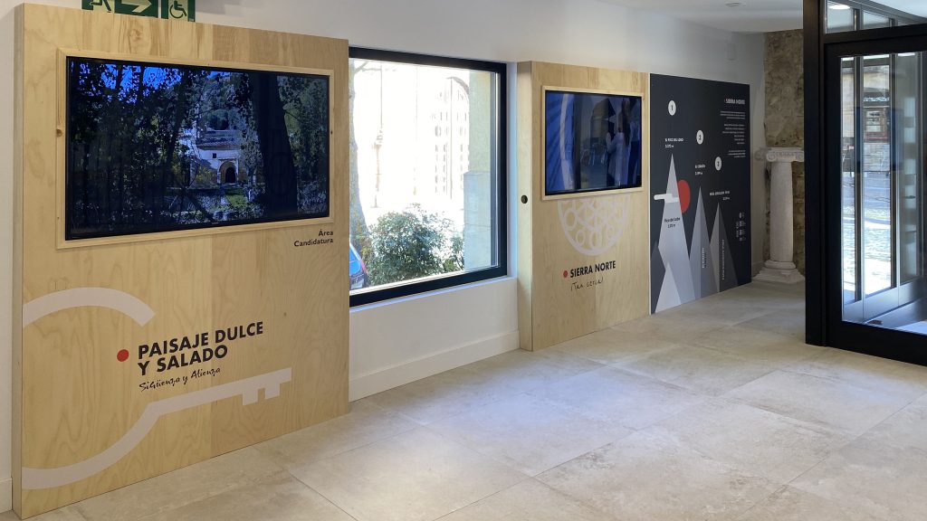 En primer lugar, se presentan los orígenes de la ciudad y de sus riquezas a través de la sal y los entornos en los que surge, como piedra angular de su devenir histórico, reforzando además la importancia de la misma en el conjunto del Paisaje Dulce y Salado que conforma la candidatura de Sigüenza a Patrimonio Mundial. Un molino salinero, un pequeño texto explicativo y algunos términos sobre la sal y las salinas despiertan la curiosidad del visitante, invitándole a conocer más en profundidad este milenario patrimonio salado. De la misma manera que tiene protagonismo en la oficina, la candidatura también lo esta teniendo en FITUR, con un mostrador propio en el expositor de Castilla-La Mancha.