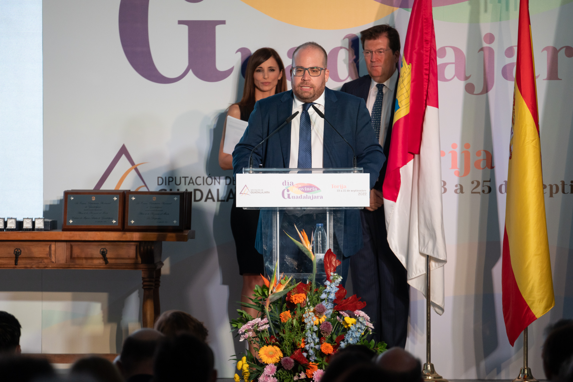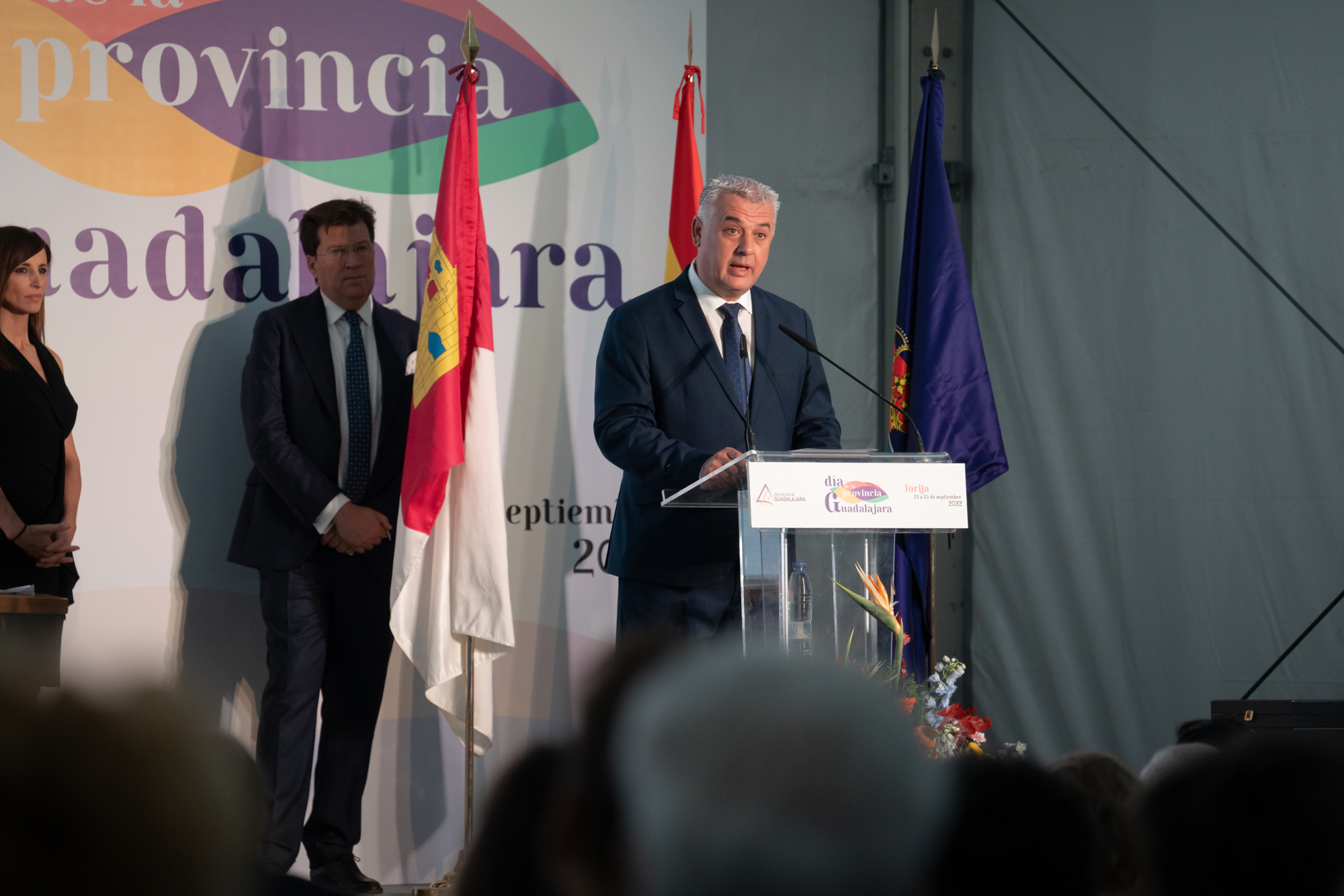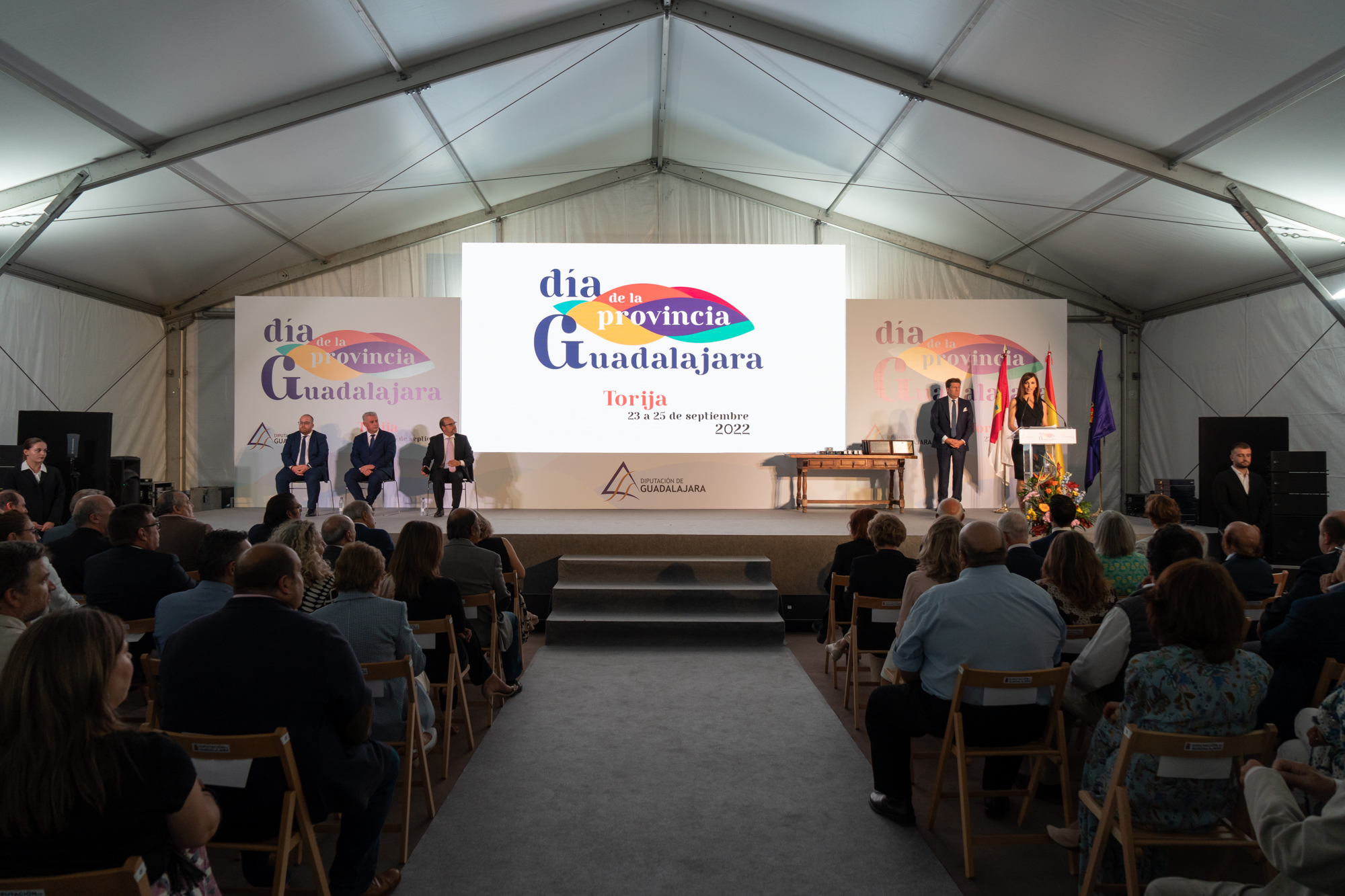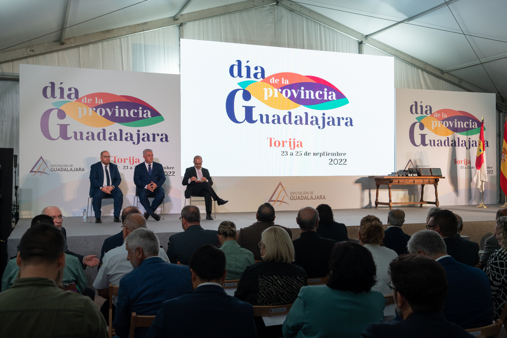 El acto institucional del Día de la Provincia estuvo presidido, junto a José Luis Vega, por el alcalde de Torija, Rubén García, y el presidente de las Cortes de Castilla-La Mancha, Pablo Bellido.