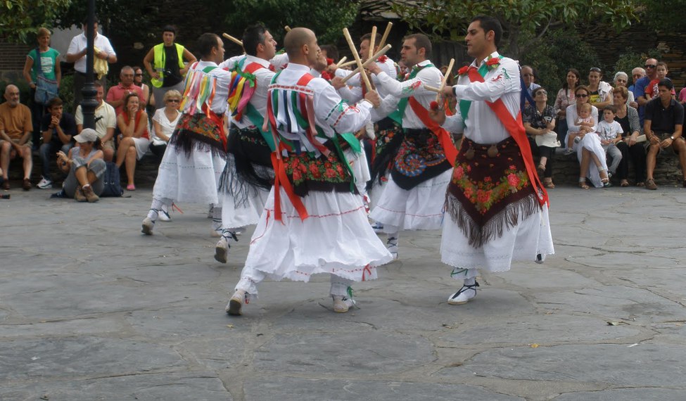 Bailes ejecutado sólo por hombres, ataviados con faldas y con gorros multicolores. No estamos hablando de Majaelrayo y de Valverde de los Arroyos… o no solamente.