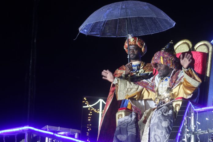 También se repartieron más de 2.000 kilos de caramelos sin gluten y hasta 10.000 coronas de reyes de cartón en una cabalgata que partió puntual a las 18:30 de la calle Madrid, para ascender por la calle Mayor hasta Santo Domingo, donde tras dar la vuelta a la mitad del Paseo de Fernández Iparraguirre, en un recorrido cubierto por vallas antivuelco, llegaba junto a la iglesia de San Ginés, donde se realizó la adoración al Niño, al que sus majestades entregaron el oro, el incienso y la mirra que traían de Oriente.
