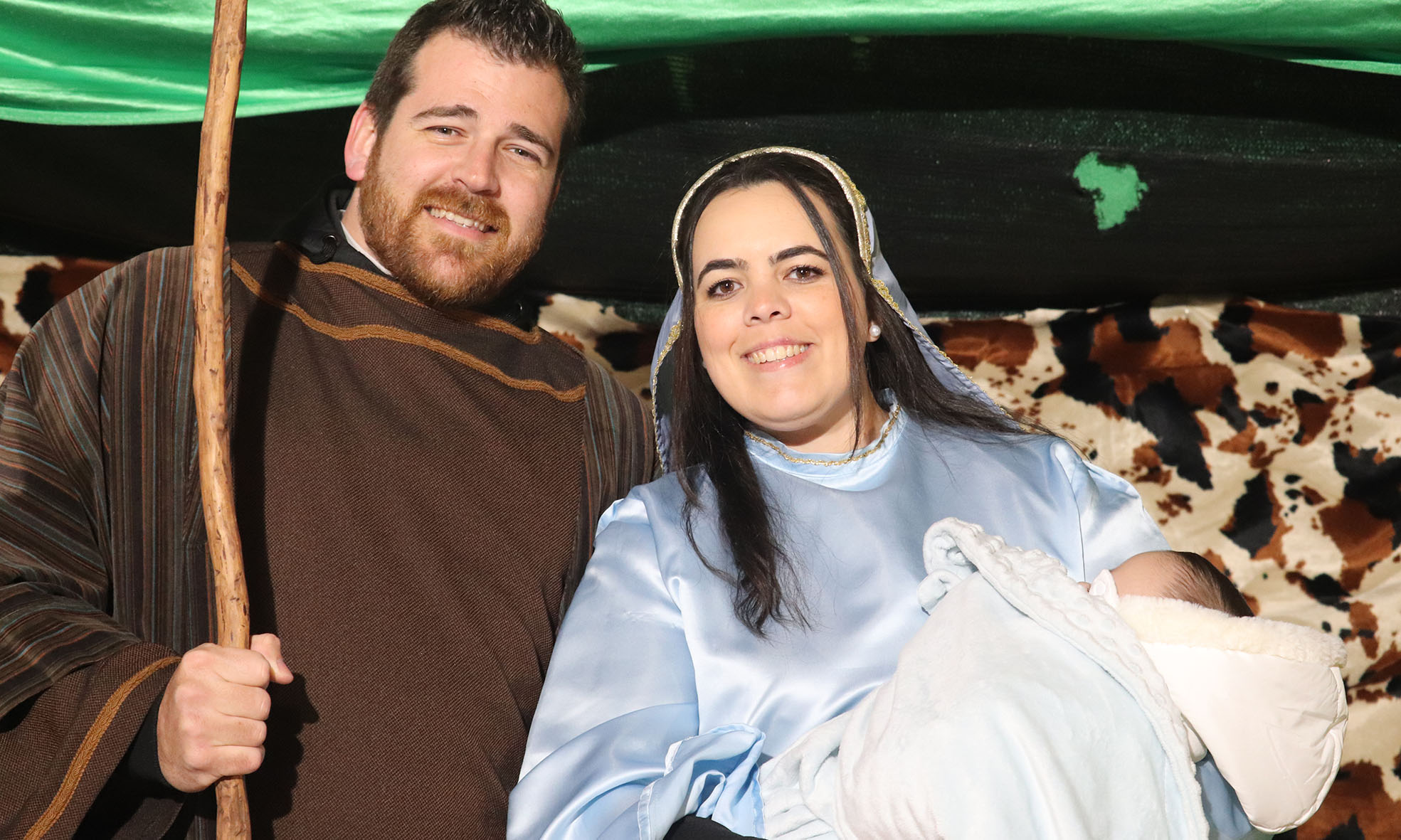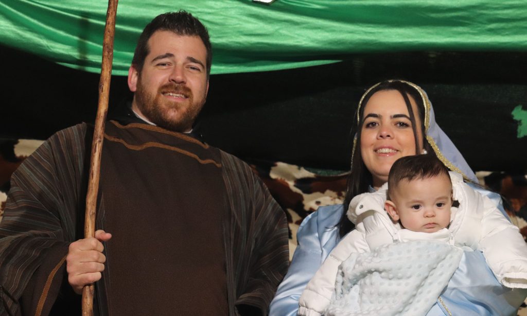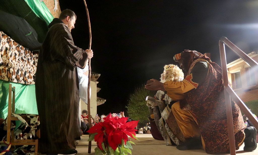 Durante el desfile, y como es tradición en Cabanillas, los tres Reyes pararon a la altura de la Plaza de la Iglesia para representar la «Adoración al Niño», en el belén viviente que instala cada año la Asociación San Blas, donde estaban pacientemente esperando San José, María y el pequeño Jesús.