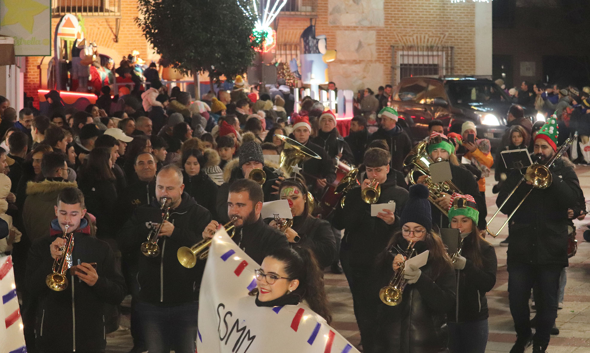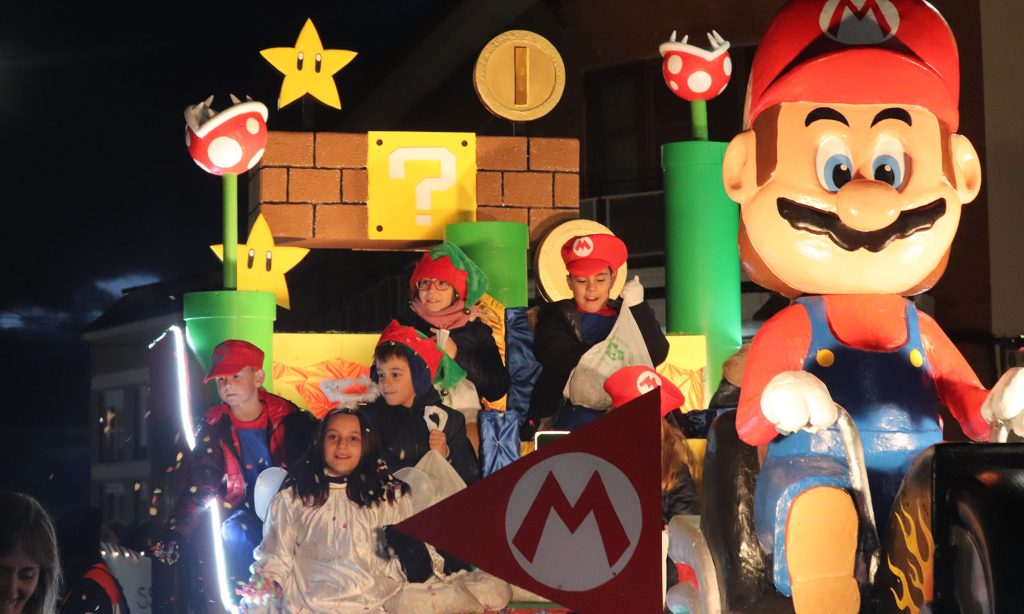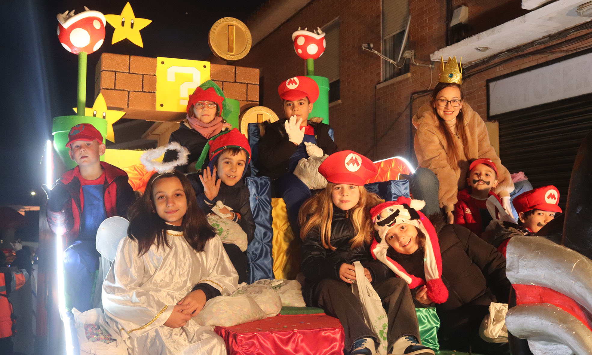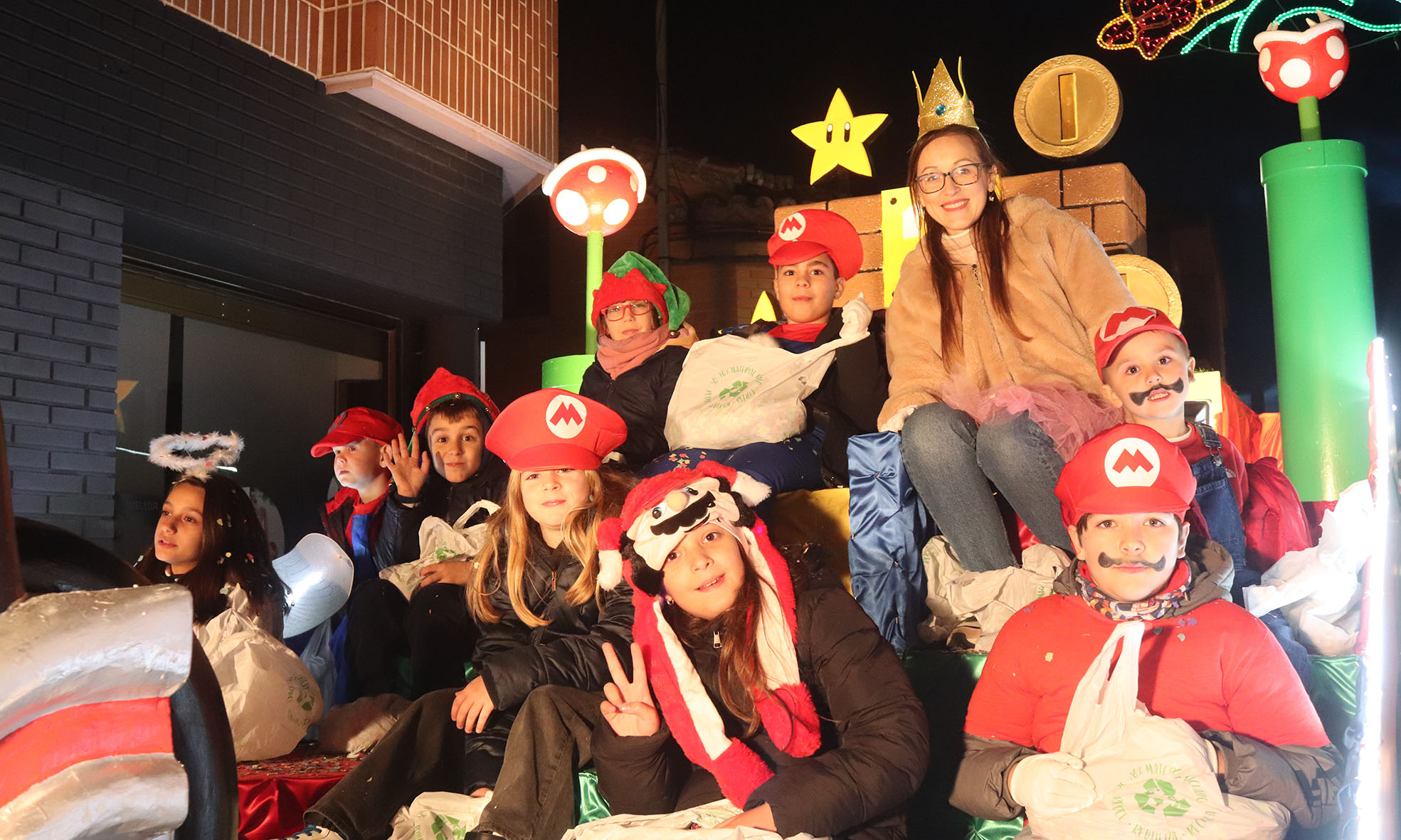 Una comparsa de muñecos infantiles de dibujos animados, seguida de una carroza ambientada en el personaje Mario Bross, y otra comparsa de vistosos personajes-cartas a los Reyes, daba paso al siguiente grupo musical: la tradicional banda de clarines y trompetas, que no paró de tocar villancicos por todo el recorrido.
