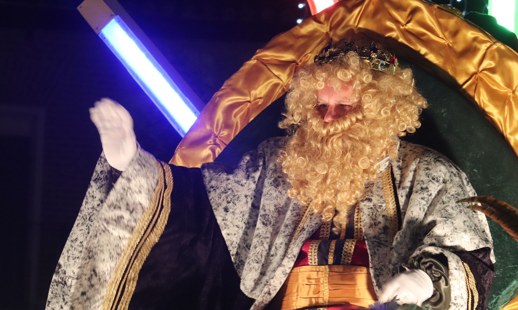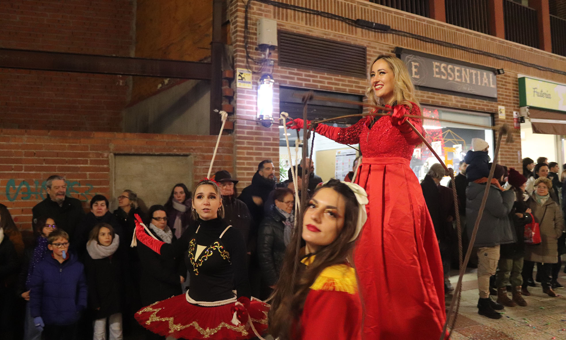 Tras el rey de barba blanca, otra llamativa comparsa de «carboneros» (por si algún niño o niña no se había portado demasiado bien), y un nuevo pasacalles de fantasía, sobre juguetes mágicos, con zancudos, peluches, muñecas, tragafuegos y bailarinas, que daba paso a la segunda carroza real: la de Gaspar.
