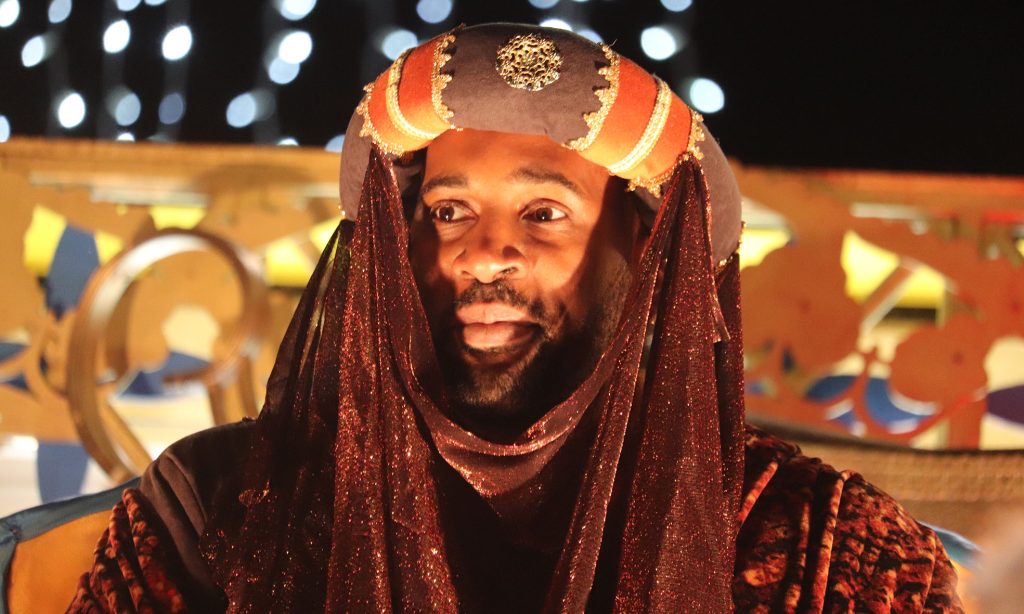 Entre Gaspar y Baltasar, más ambientación: la comparsa «Vamos a la cama», con jóvenes en pijama bailando sin parar, y un tercer pasacalles fantástico, esta vez ambientado en el mundo de «Aladino y la Lámpara Maravillosa», con malabaristas, zancudos y acróbatas. Y ya como colofón, la carroza del Rey Negro, siempre el favorito de los niños, que cerraba la comitiva.