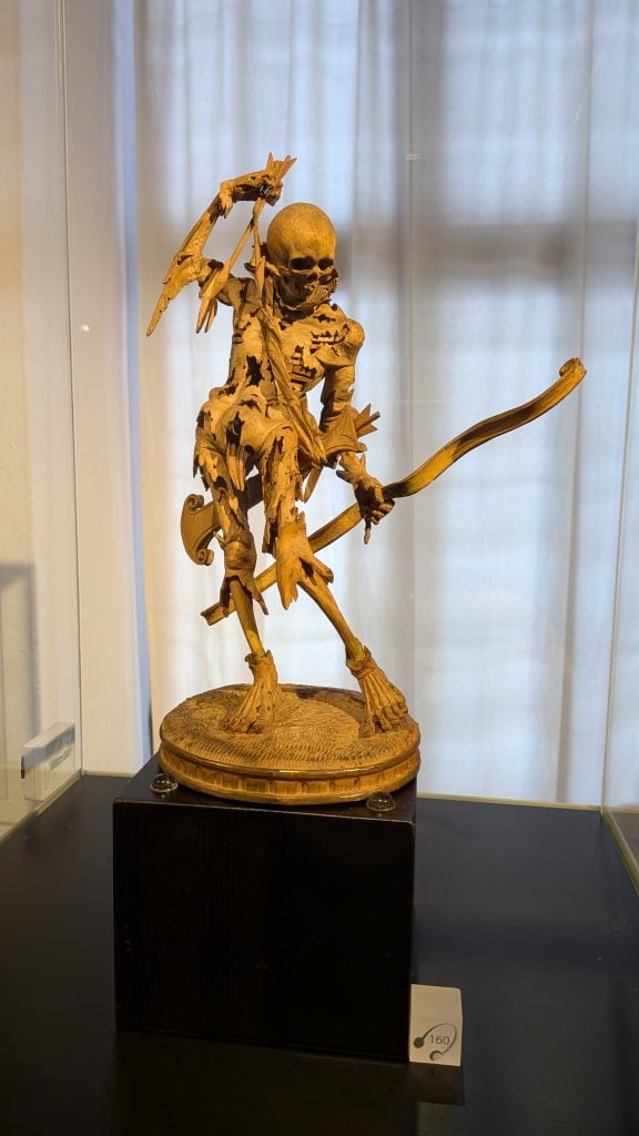 Representa a la muerte en la forma de un arquero que se prepara para sacar su flecha del carcaj. La escultura está tallada en madera de peral, con partes fragilísimas. Fue creada por el escultor Hans Leinberger a finales del siglo XVI.