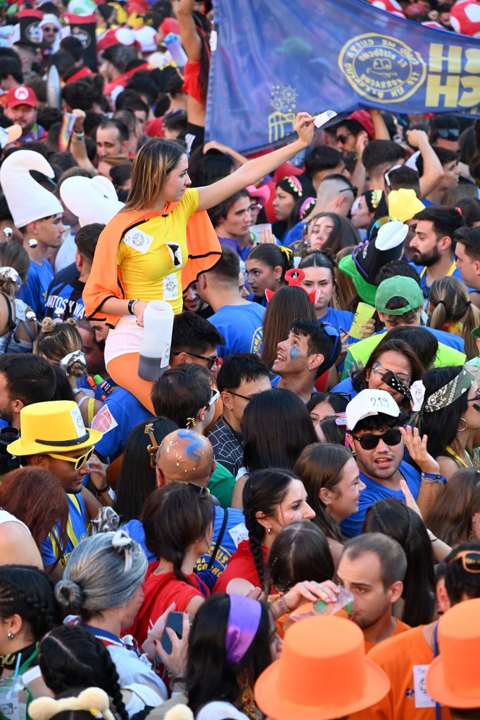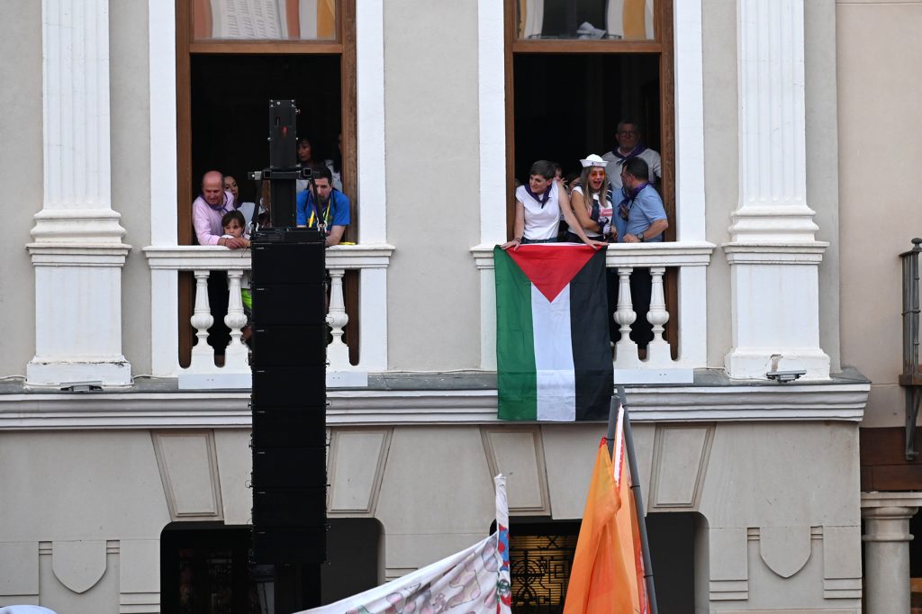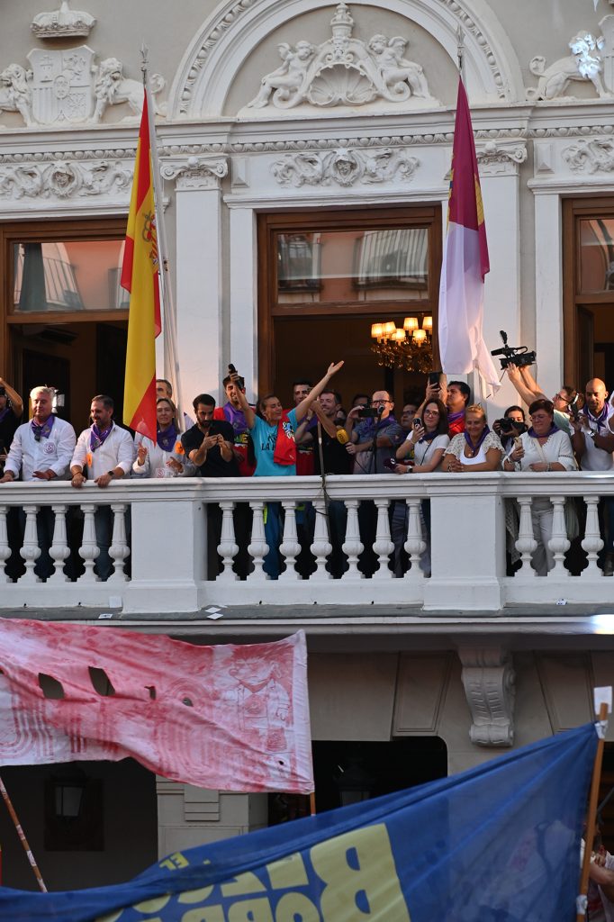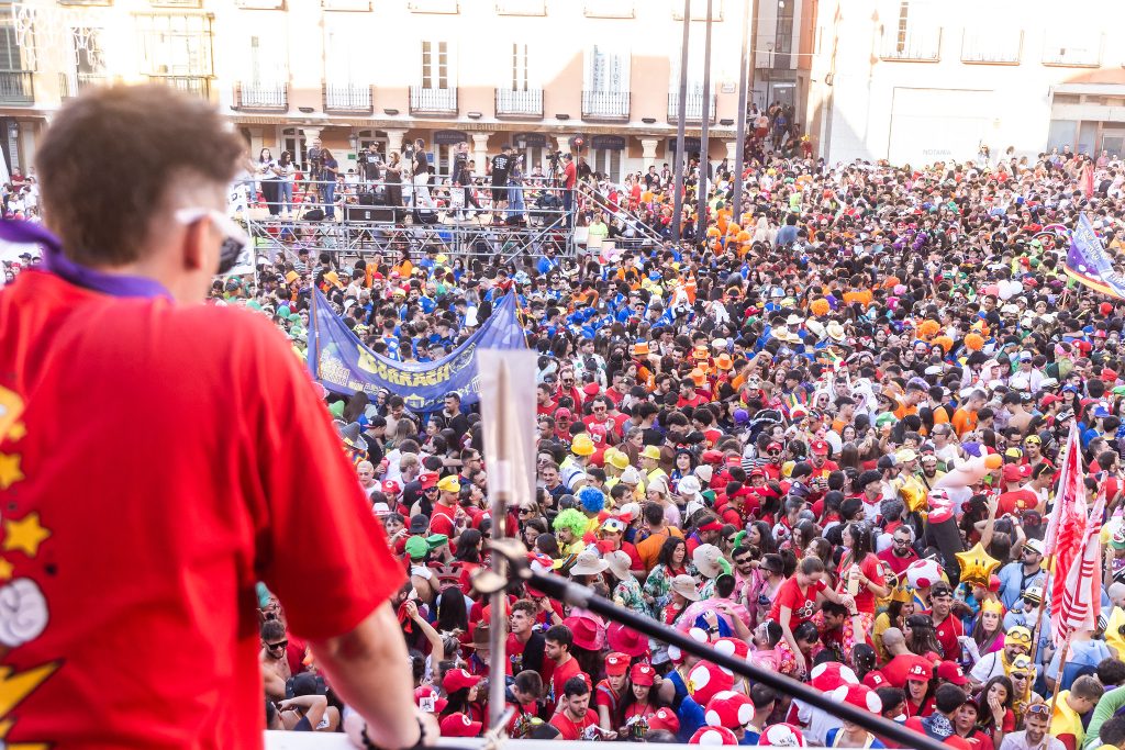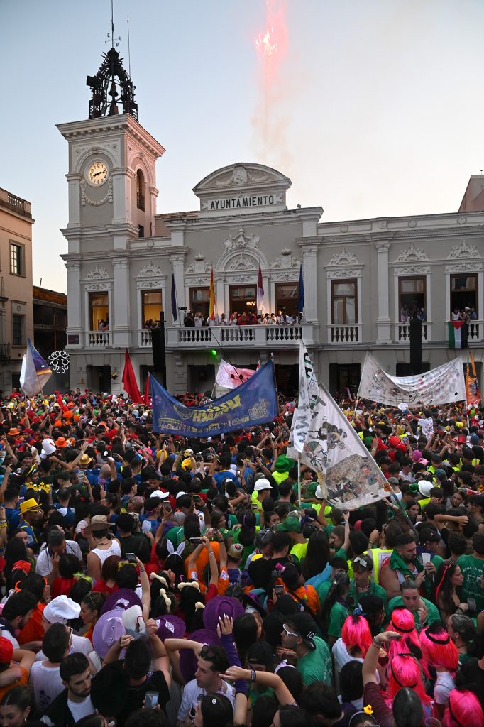 A mitad de ese pregón y cuando la plaza ya vibraba de emoción, llegó el momento más inesperado y celebrado con la sorpresa preparada por la Peña El Buey: Isabel Aaiún irrumpió en el balcón y la marabunta de peñistas entró en ebullición coreando y bailando al son de la Potra Salvaje.
