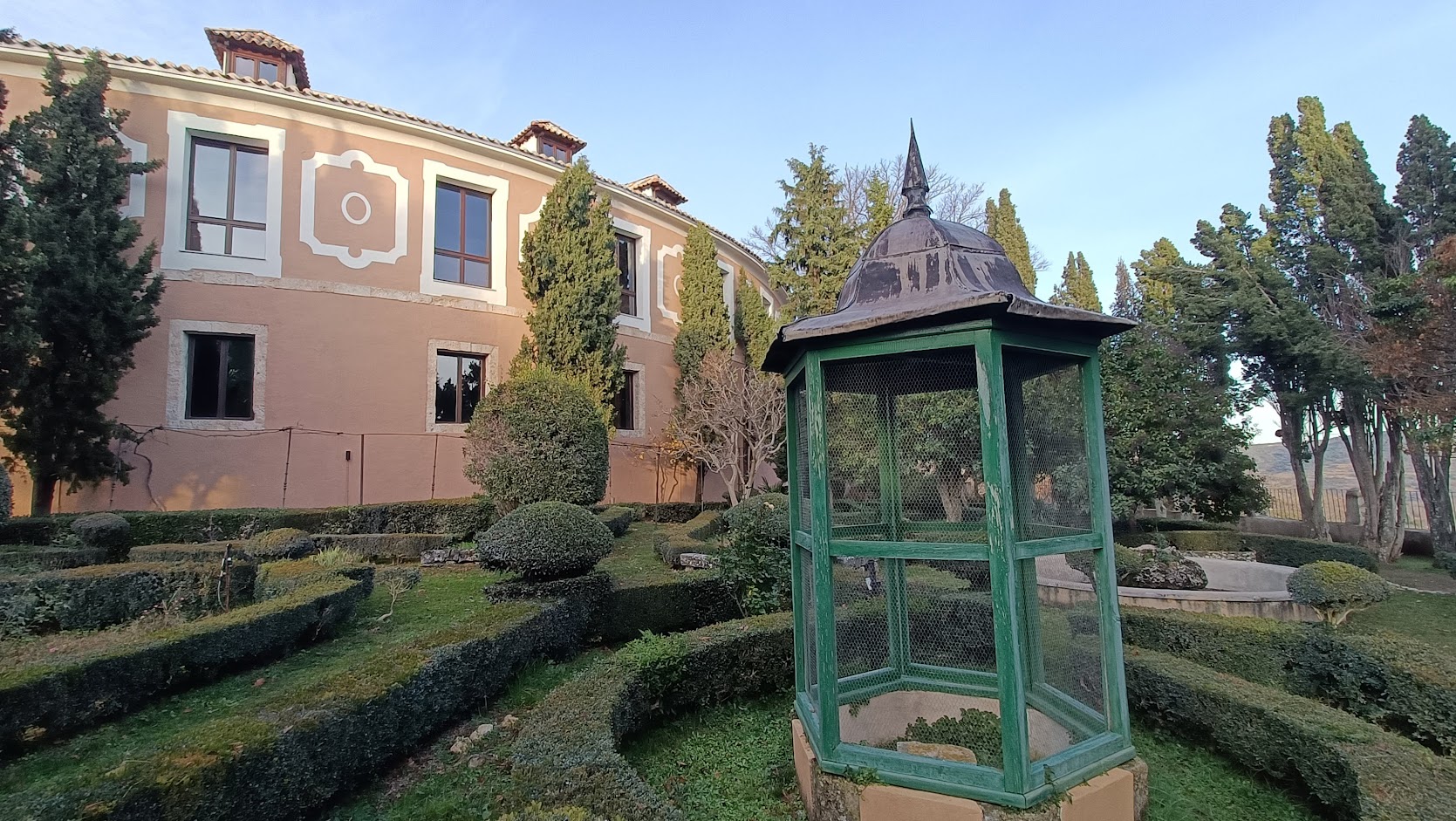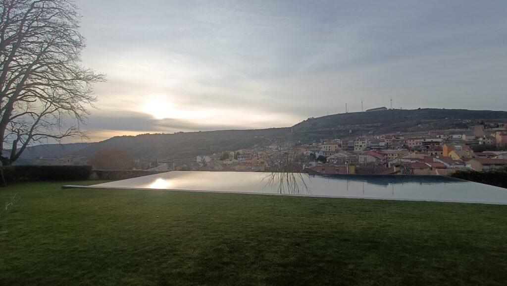 La vista de Brihuega desde los jardines «románticos» de la antigua Fábrica de Paños es espectacular. Tanto como la piscina infinita que aguarda a que pase el invierno, llegue la primavera y termine por plantarse ante nosotros el verano de 2024 con el calor que justifique el chapuzón. Ahora mismo es sólo una lámina de agua que se pierde suavemente contra el caserío.