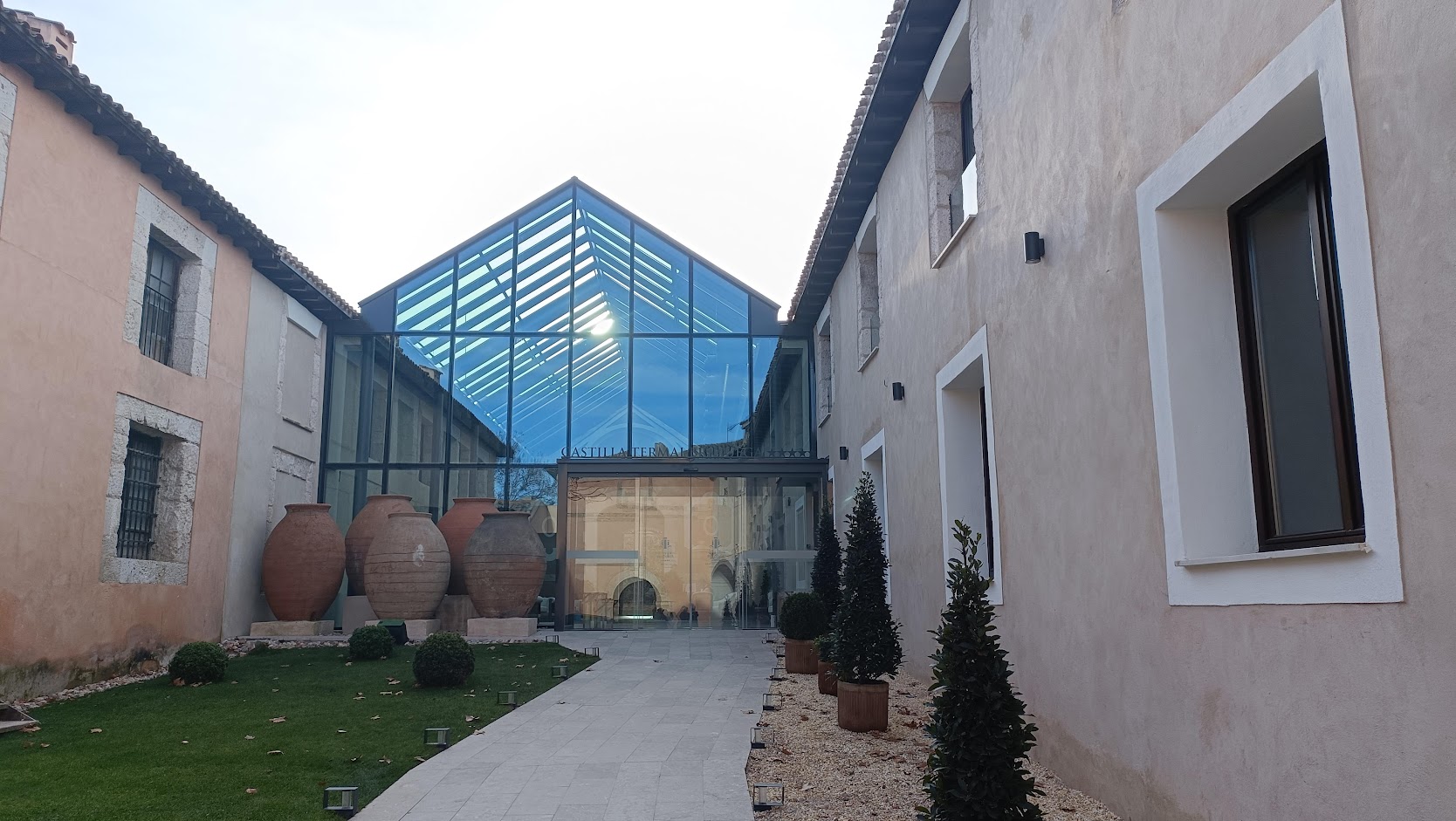 La entrada al complejo desmerece, porque hay que localizar primero desde la Alameda la portada exterior, avanzar por entre algún coche dejado allí al descuido por los clientes y plantarse ante la puerta y bajo el escudo. A partir de ahí, la cosa cambia… muy para bien.