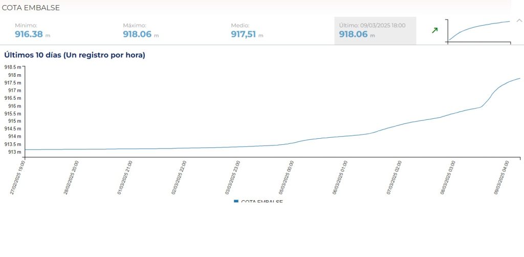 Según los datos consultados por LA CRÓNICA, a las siete de la tarde del domingo la cota está en 96,78 metros. Son casi alrededor de tres metros y medio más que el pasado 4 de marzo, que es cuando empezó a subir. Y también, casi un metro más que a las ocho de la mañana de este mismo 9 de marzo, que es cuando se tomó la fotografía que acompaña esta información. A las nueve de la noche del 8M todavía estaba por los 95 metros de cota, lo que denota a las claras el fuerte incremento de las últimas horas.