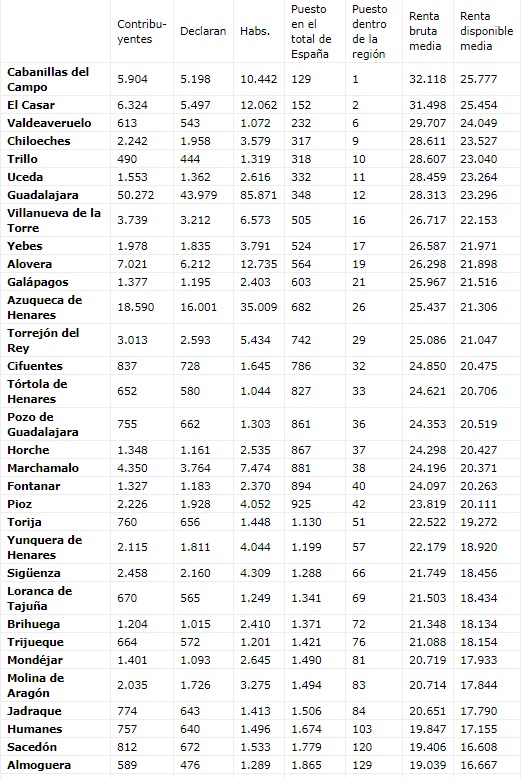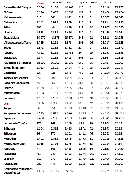 Los datos de los pueblos de más de 1.000 habitantes de la provincia de Guadalajara, referidos a la campaña de la Renta de 2018, son estos: