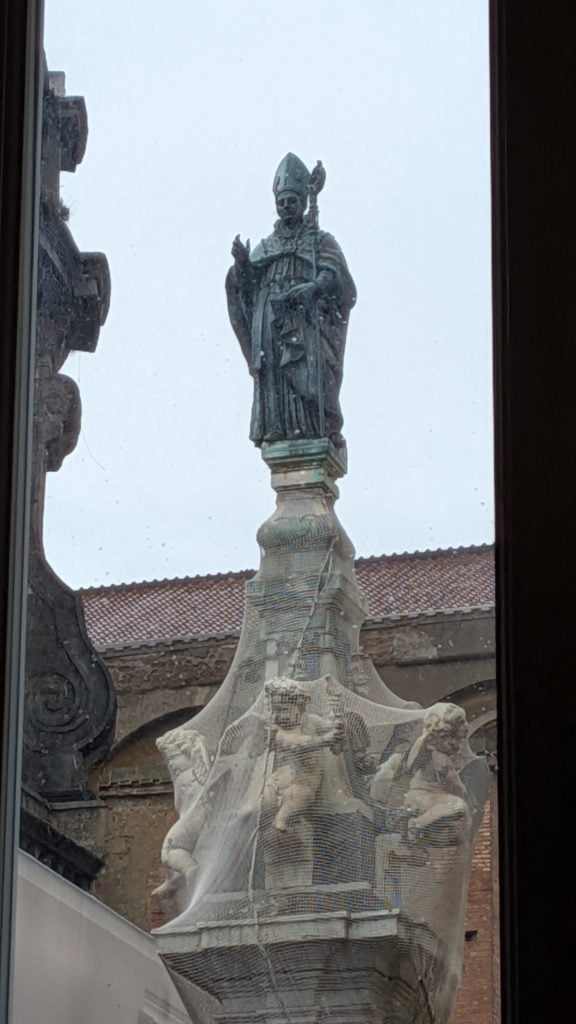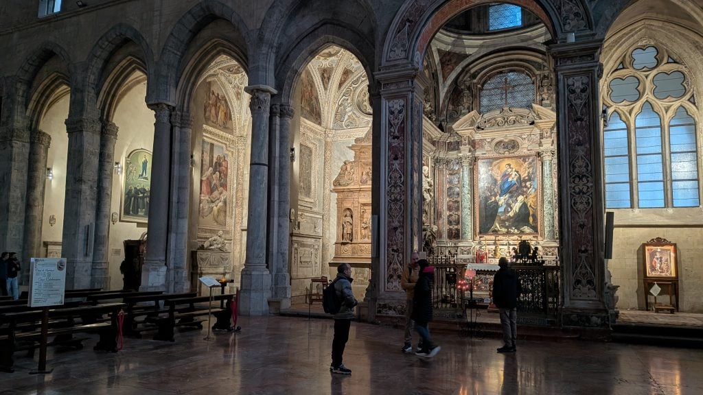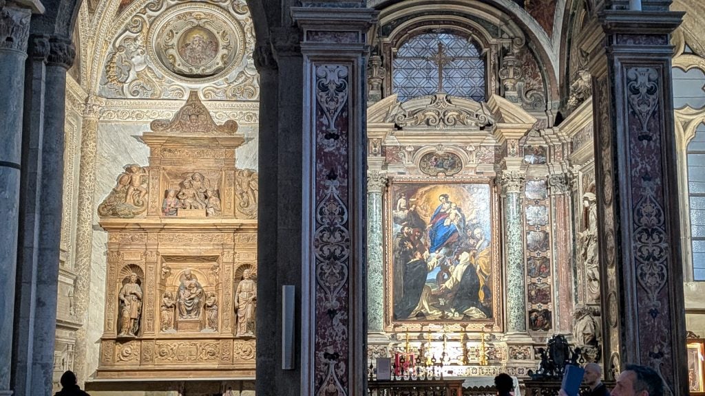 En busca de su capilla hay que entrar al Duomo. Esa mañana, de tormenta tropical, diluvia fuera y llueve también dentro, a los pies del templo, gracias a unas goteras que aportan unos inesperados efectos especiales.