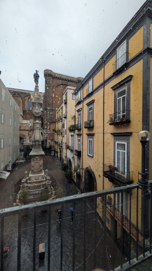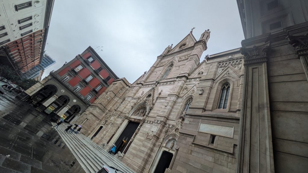 La catedral napolitana es tan grande que daría refugio a miles de viandantes, que prefieren agazaparse fuera, bajo los paraguas.