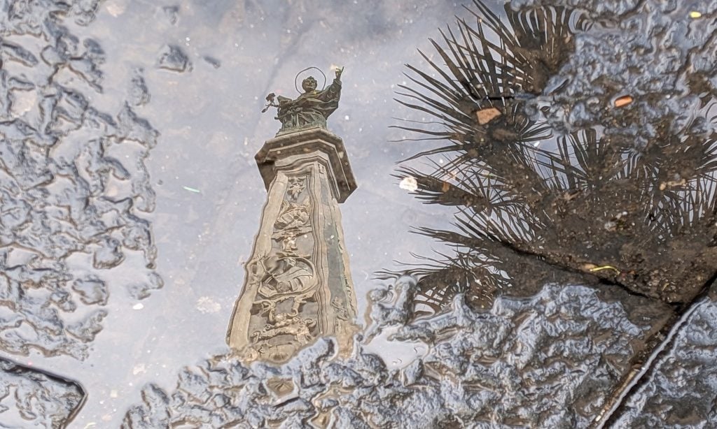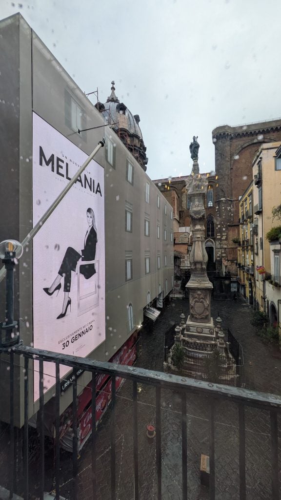 Fuera, San Genaro está encaramado en lo alto de una columna que se diría protegida de diversas amenazas envuelto en un colosal preservativo, al tiempo que al lado se anuncia una película de doña Melania, la legítima de Trump, señor del mundo.