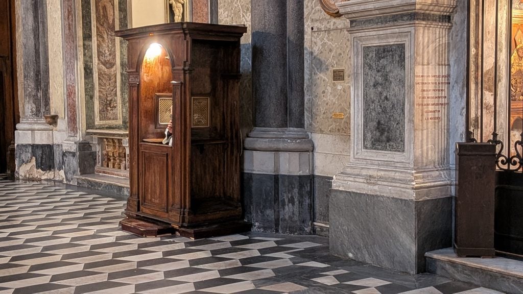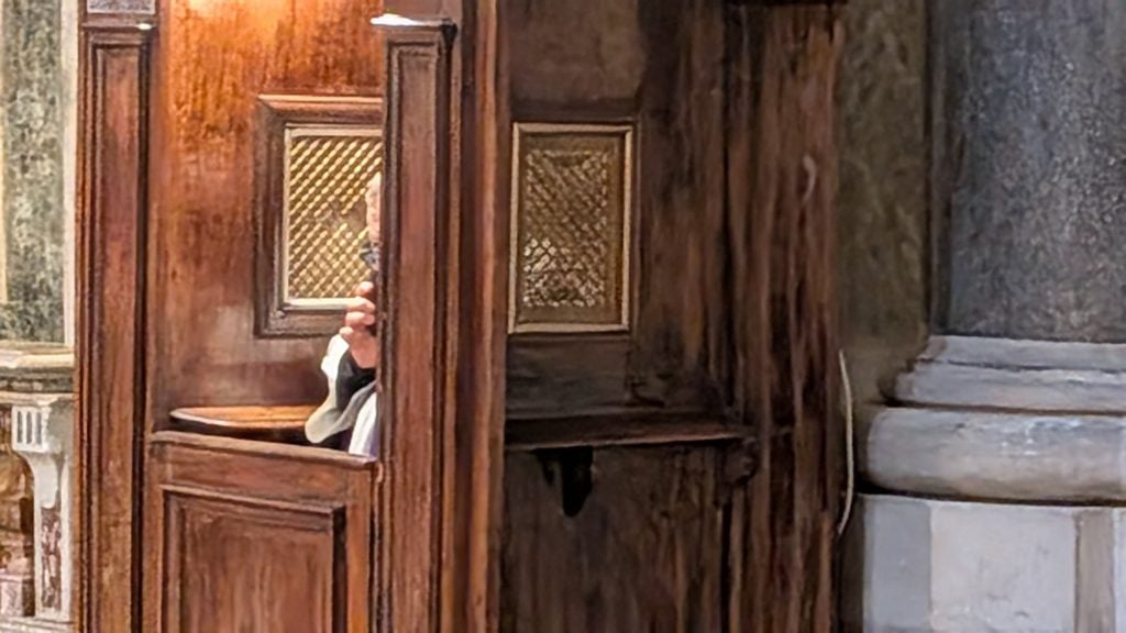 Así es hasta que una voz nos hace salir hacia la nave central: al lado, en un confesonario, el sacerdote habla con una feligresa que no está aquí sino al otro lado del telefonino; lo hace en voz alta, sin secreto de confesión que valga y durante un buen rato. El periodista, discreto, intenta no escuchar, pero la escena le mantiene atrapado como a un inesperado voyeur.