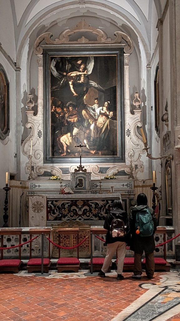 San Nicola alla Carità merece un buen rato no sólo por el sosiego que regala sino por la armonía de su barroco interior. En el altar mayor, detrás de los velones nos atrapa la escenografía cinemascope de la muerte de San Nicolás, gran obra de Paolo de Matteis, un seguidor de Luca Giordano.