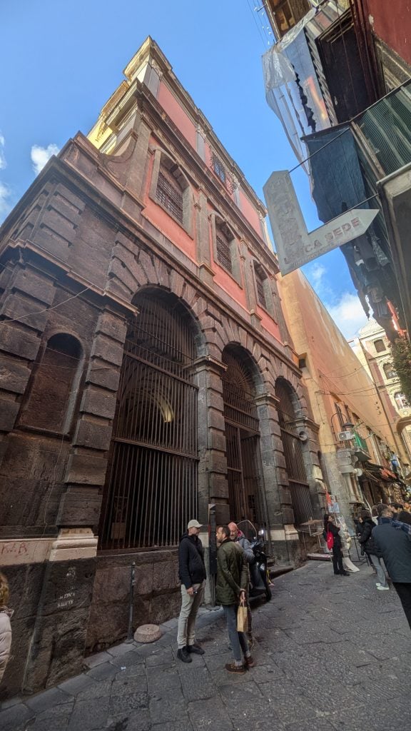Una iglesia en lo más profundo del centro histórico de Nápoles se esconde detrás de una fachada anodina y triste. Una arcada con rejas cierra un pórtico sustentado por columnas de piedra volcánica, donde en tiempos se agrupaban los pobres para recibir la caridad.