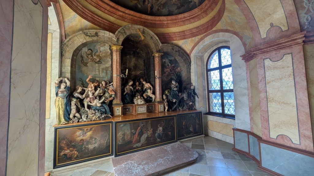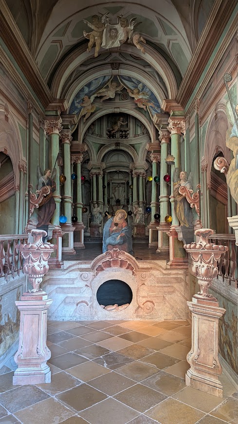 No faltan los mármoles de pega, salidos del pincel de hábiles artesanos, pero el engaño llega a una superlativa categoría de enternecedora obra de arte en la representación del Santo Sepulcro.