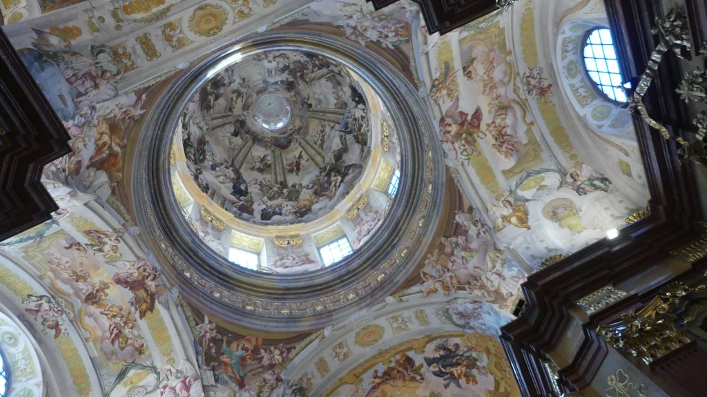 Del exterior entra una luminosidad digna del Cielo con unas tonalidades ajenas a lo ordinario. Y junto con el brillo de la luz, el esplendor de una decoración rebosante, animada por el propósito de acercarse, para enaltecerlo, al brillo del Creador. Incluso donde no hay oro, como en los estucos del techo salidos de las manos de Santino Bussi, el derroche de belleza es imparable.