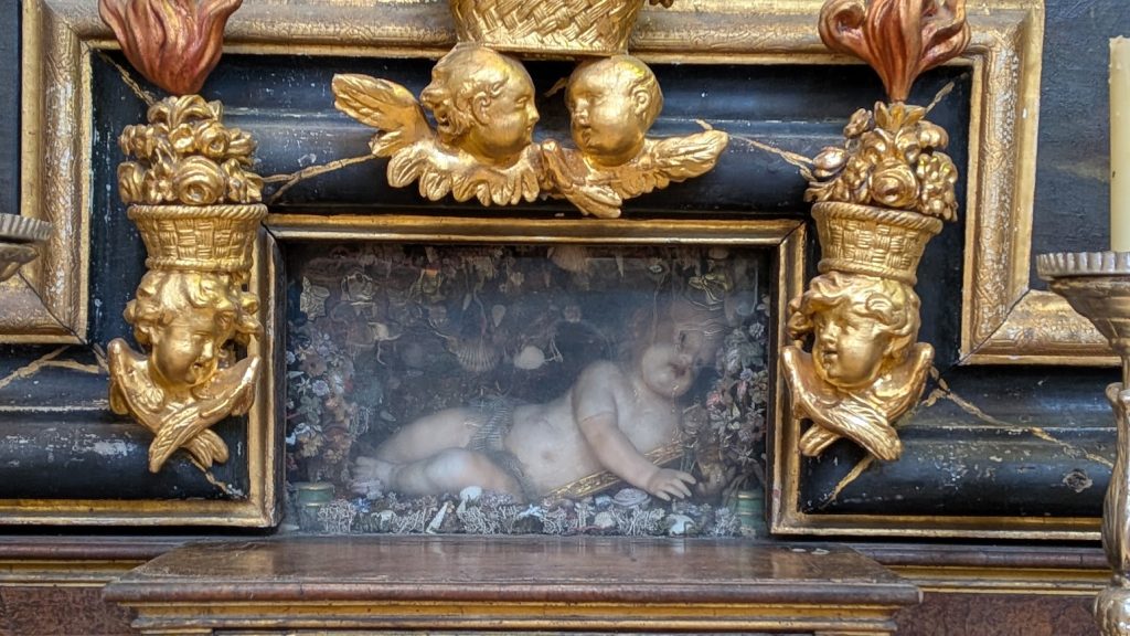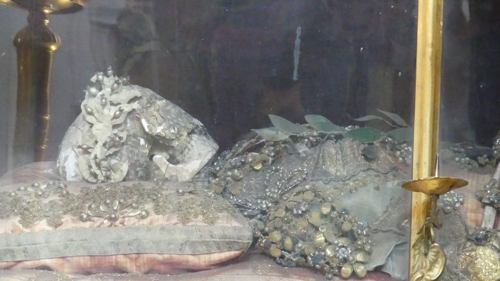 No siempre es posible ver lo que llaman claustro y es, más propiamente, una galería de insólitas curiosidades barrocas del siglo XVIII, dispuestas en pasillos y capillas. Se queda fuera del circuito ordinario de visitas. El periodista tuvo el privilegio de verlo y de escribir para contarlo.