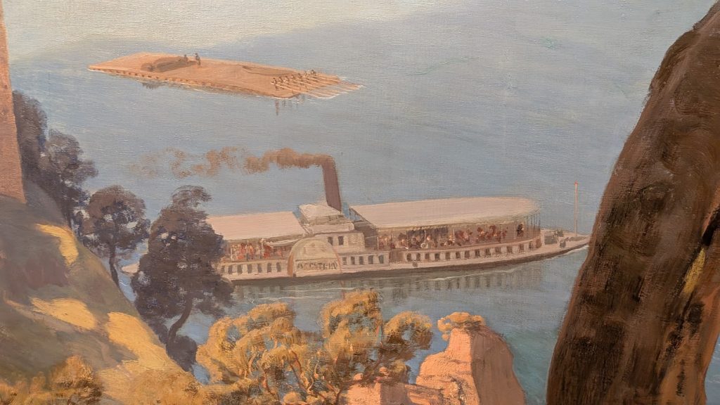 Décadas después, en los muchos metros cuadrados de un óleo lo que se refleja es un barco de ruedas a vapor, más propio del Mississippi. Sueño o realidad, no lo sabemos a ciencia cierta. Seguramente, un canto a la modernidad por ver si llegaba.