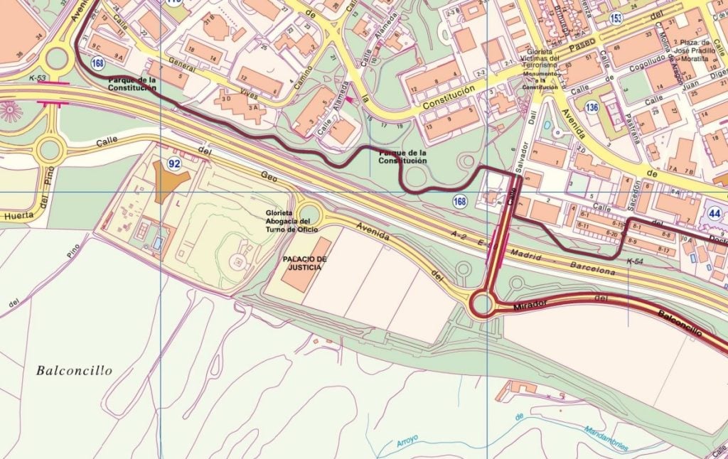 El croquis parece claro dentro de lo necesariamente embarullado de reflejar tantas posibles salidas. La costumbre también ayuda a no equivocarse, claro está. La Avenida del Ejército, la vuelta hacia Madrid o la posibilidad de retomar destino en dirección a Zaragoza, el polígono del Balconcillo o lanzarnos a descubrir qué se encierra en la Huerta del Pino, yermo de cardos y proyectos frustrados.