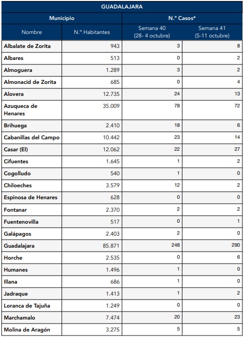 Como se puede comprobar más abajo, en las tablas que adjuntamos, las localidades que han aumentado el número de casos de una semana con otra son Albalate de Zorita, Albares, Almonacid de Zorita, El Casar, Cifuentes, Guadalajara, Horche, Jadraque, Marchamalo, Sacedón, Tórtola de Henares, Trijueque, Trillo, Uceda y Valdeaveruelo.