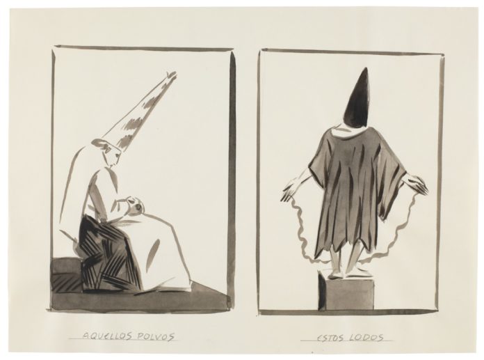 Precisamente el título que El Roto propone para esta muestra, en el Claustro de los Jerónimos hasta el 16 de febrero, es también el de un dibujo del artista de Fuendetodos, perteneciente al Cuaderno C, que se puede ver solo unos metros más abajo, en una exacta vertical. La obra de Goya, con quien Rábago comparte una punzante visión crítica, es en este caso el punto de partida de la profunda y sosegada meditación de El Roto.
