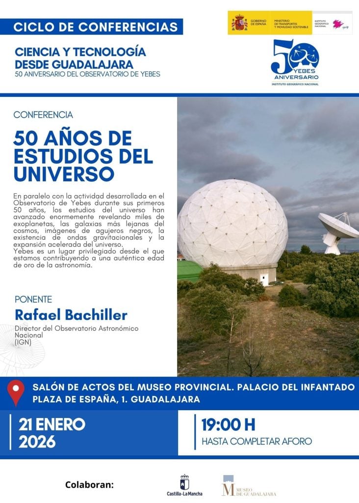 Para celebrar los 50 años de trayectoria científica y tecnológica del Observatorio de Yebes, el Instituto Geográfico Nacional (IGN) ha diseñado un programa de actividades que se desarrollará desde octubre de 2025 hasta agosto de 2026.