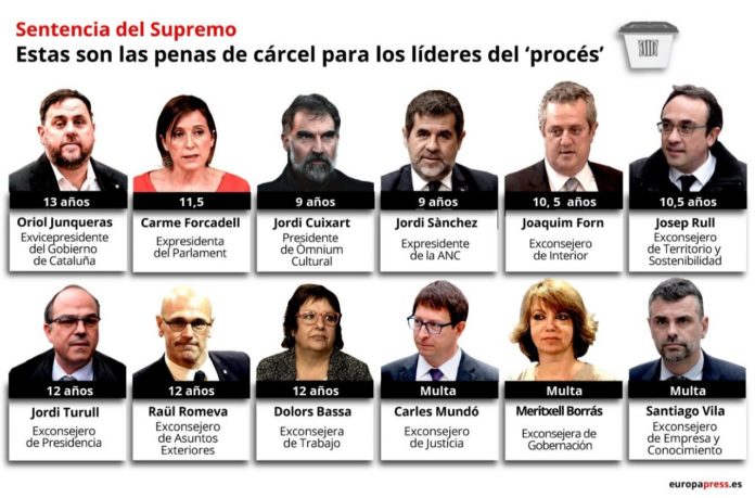 La Sala de lo Penal del Tribunal Supremo ha dictado este lunes su sentencia sobre los 12 acusados de promover el denominado 'procés' independentista en Cataluña durante el otoño de 2017. Este es el veredicto para cada uno de los enjuiciados, de los que nueve están cerca de cumplir dos años en prisión provisional: