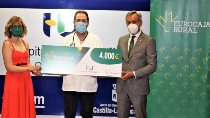 El presidente de Eurocaja Rural Javier López Martín, acompañado de la adjunta comercial a la Dirección Territorial de Guadalajara de la cooperativa de crédito, María José García, ha hecho entrega de los 4.000 euros de esta ayuda al doctor Miguel Torralba González de Suso, facultativo especialista del Área de Medicina Interna del Hospital Universitario de Guadalajara.