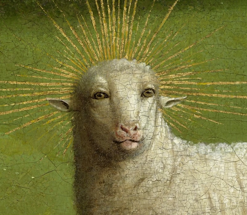 El Cordero del Políptico de Gante como se ha visto durante siglos, con sus ojos dispuestos lateralmente.