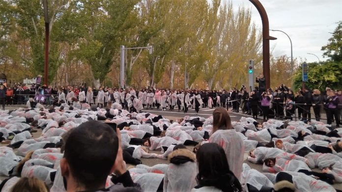 El objetivo era concienciar sobre la violencia de género y el resultado fue especialmente impactante: cientos de voluntarias, vestidas de negro, avanzaban lentamente porla calzada, totalmente en silencio para acto seguido vestirse con batas previamente teñidas de rojo y postrarse una a una sobre el suelo, tendidas en memoria de las más de mil asesinadas desde desde 2003.