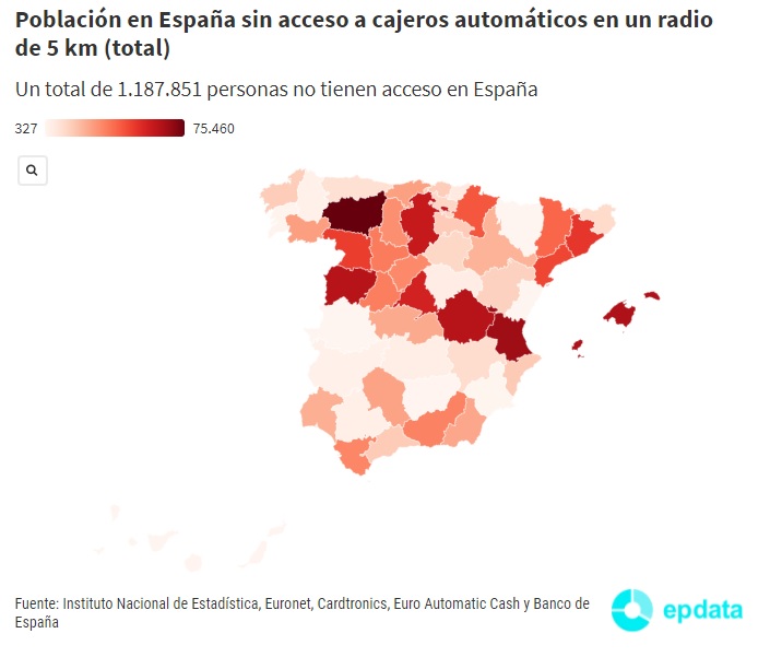 Castilla y León es la comunidad autónoma con una cobertura menos amplia, con Zamora (27,8% de la población sin acceso sobre el total), Ávila (21%), Segovia (19,9%) y Palencia (18,2%) como las provincias que presentan menores ratios de población con un punto tradicional de acceso al efectivo en un radio de cinco kilómetros.