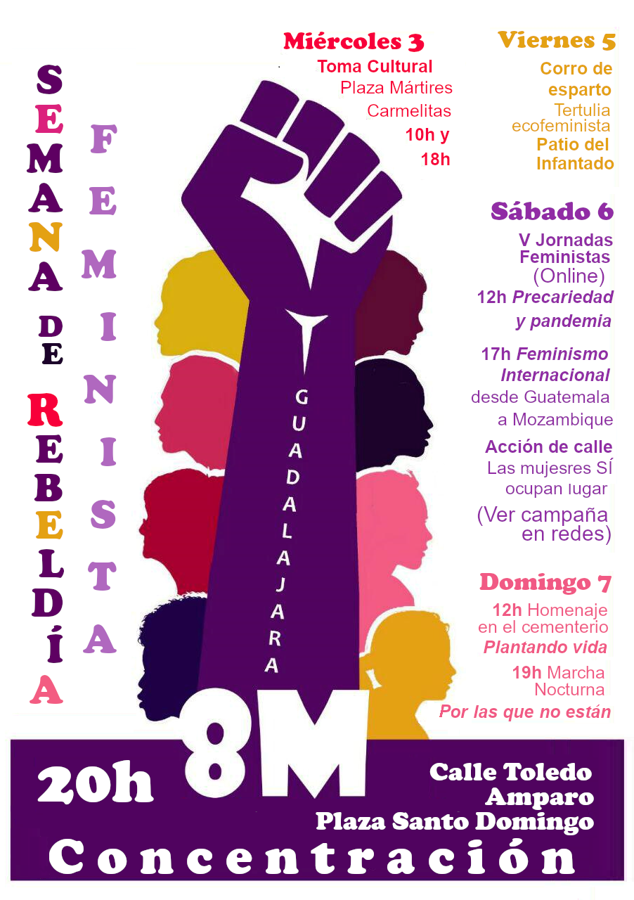 Casi una veintena de colectivos feministas de Castilla-La Mancha, entre ellos la Plataforma Feminista de Guadalajara, han elaborado una serie de actividades para celebrar el Día Internacional de la Mujer. Todas estas propuestas, aseguran, resultan «compatibles con las restricciones impuestas por la pandemia del coronavirus». Entre las iniciativas hay cadenas humanas con separación por cintas, pegadas de carteles, adorno de estatuas con prendas moradas, sentadas y concentraciones de aforo limitado y también iluminación de monumentos.