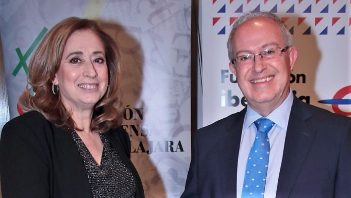 El director provincial de Ibercaja, José Luis San José, y la presidenta de la Asociación de la Prensa de Guadalajara (APG), Mar Corral, han firmado el convenio de colaboración que une a ambas entidades desde hace más de dos décadas.