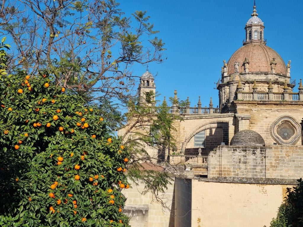 NARANJOS. Los patios y calles del centro histórico están llenos de naranjos, muy característicos del paisaje urbano andaluz. Bien cuidados, con su porte natural y en plena floración llenan las calles del olor característico de azahar. Pasear por las calles de Jerez es una auténtica delicia, el frescor, el aroma, el cuidado de sus plazas, jardines y arbolado denota el interés de este municipio por un bien tan importante y necesario como el verde urbano, haciendo la ciudad amable y habitable.