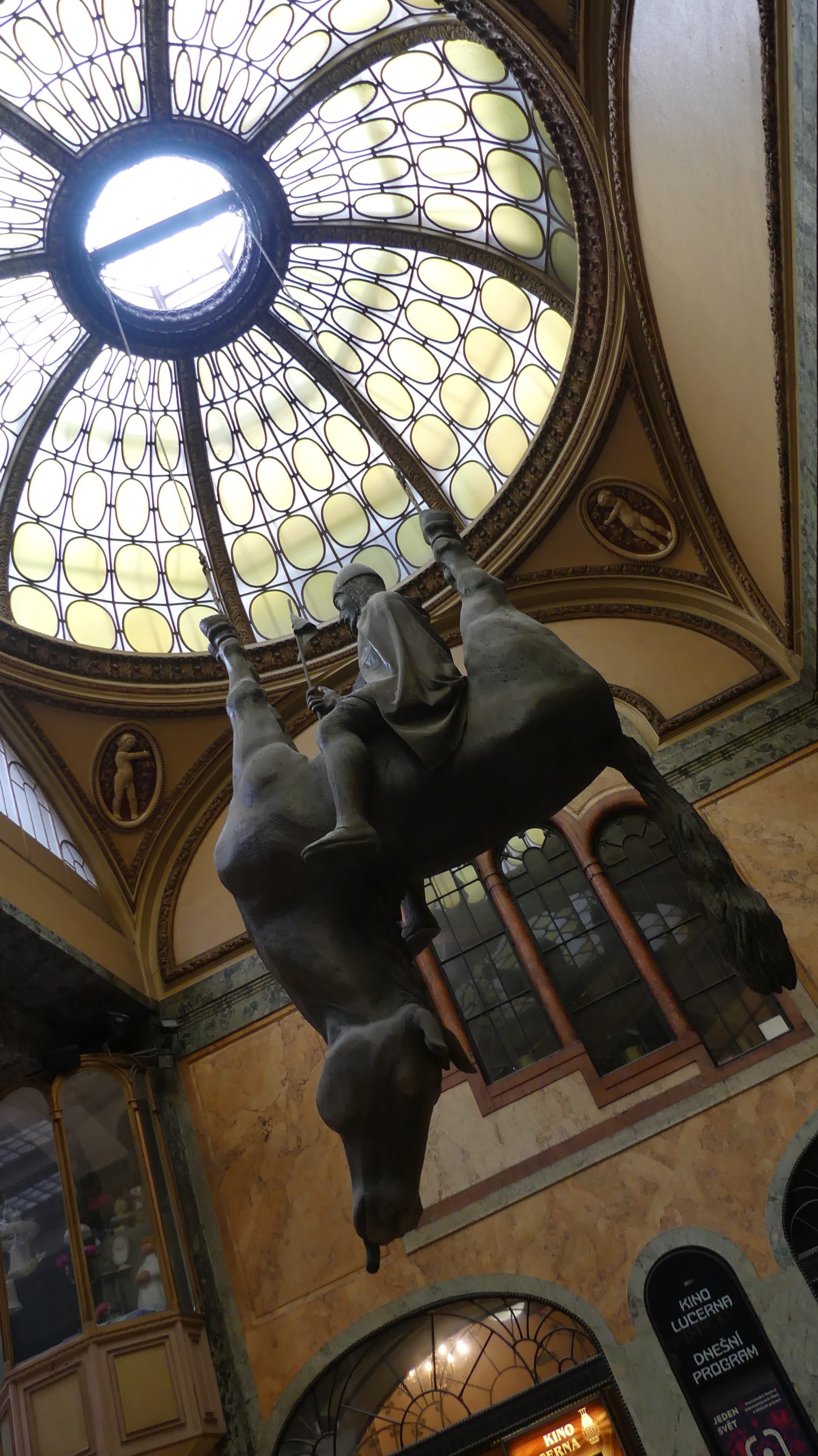 Menos conocidas, pero también deseables, son sus galerías: los comercios te abren los brazos y las puertas mientras te resguardas de la lluvia o del sol. En una de ellas, con entrada por la Plaza de San Wenceslao, el héroe local cabalga un caballo boca abajo, colgando ambos de una espectacular cúpula. Es el Pasaje Lucerna, muy recomendable por este y otros motivos: por ejemplo, si giras el cuello te encontrarás con el primer cine de Praga, empeño del abuelo de Vaclav Havel. ¿Que quién era Havel? Eso lo vas a tener que mirar tú en la Wikipedia, como castigo…