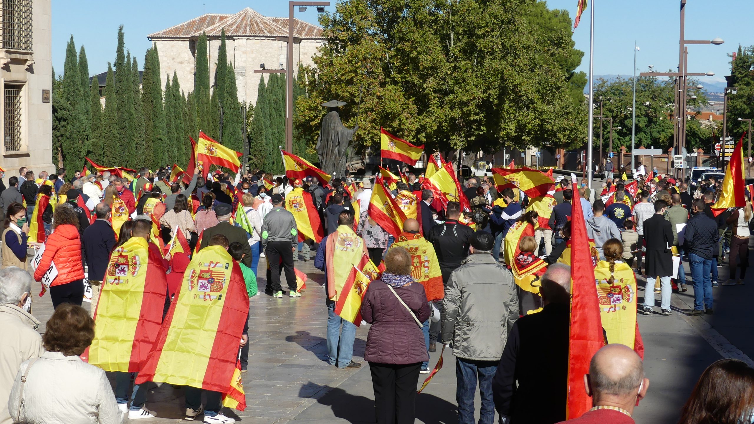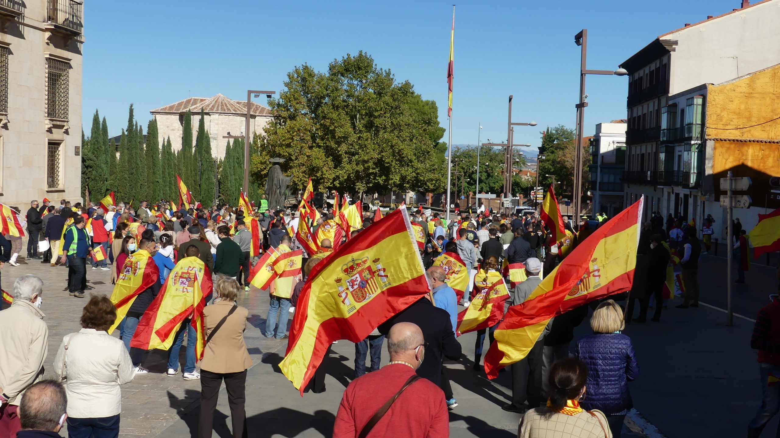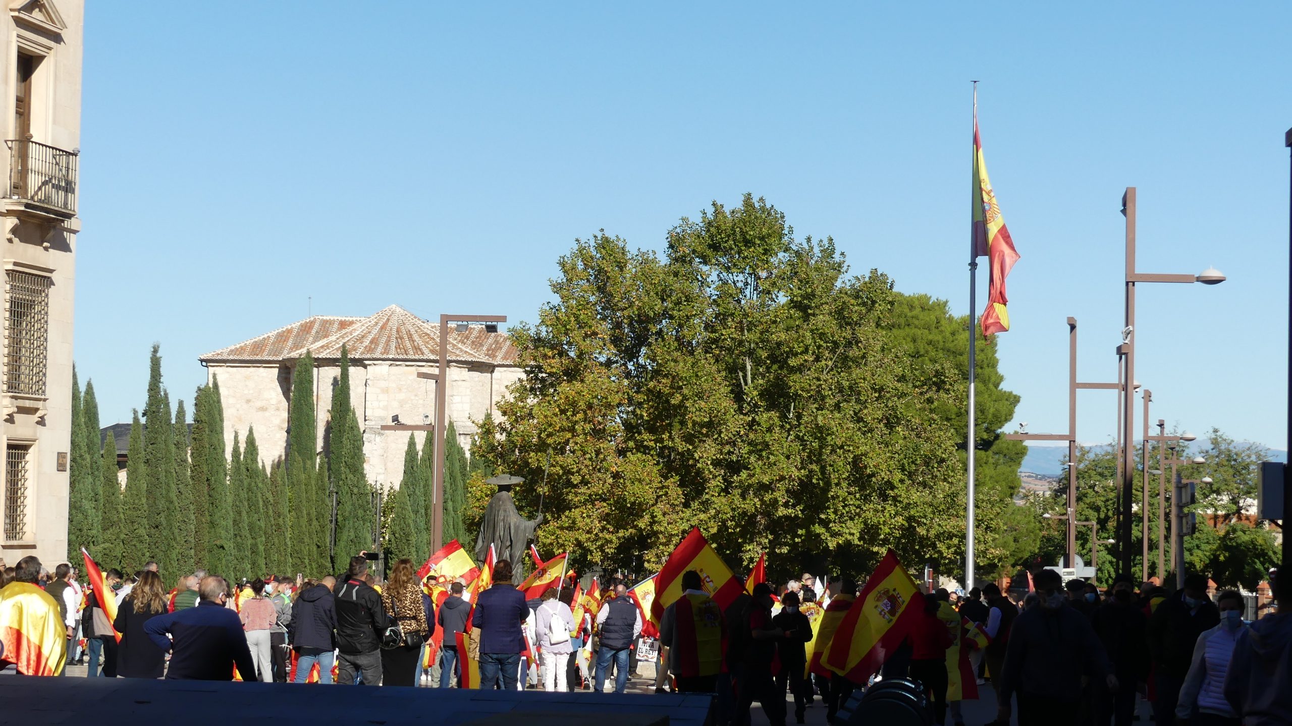 En la Plaza de España, a la sombra del Infantado apenas se aguantaba el frío de la mañana. Por eso, los que se iban reuniendo lo hacían al sol, que se agradecía. Con el paso de los minutos, junto con las banderas se dejaban ver cartelitos contra Pedro Sánchez y a favor de Felipe VI. Nada que no fuera previsible. Con media hora de retraso, los reunidos iniciaron la marcha.