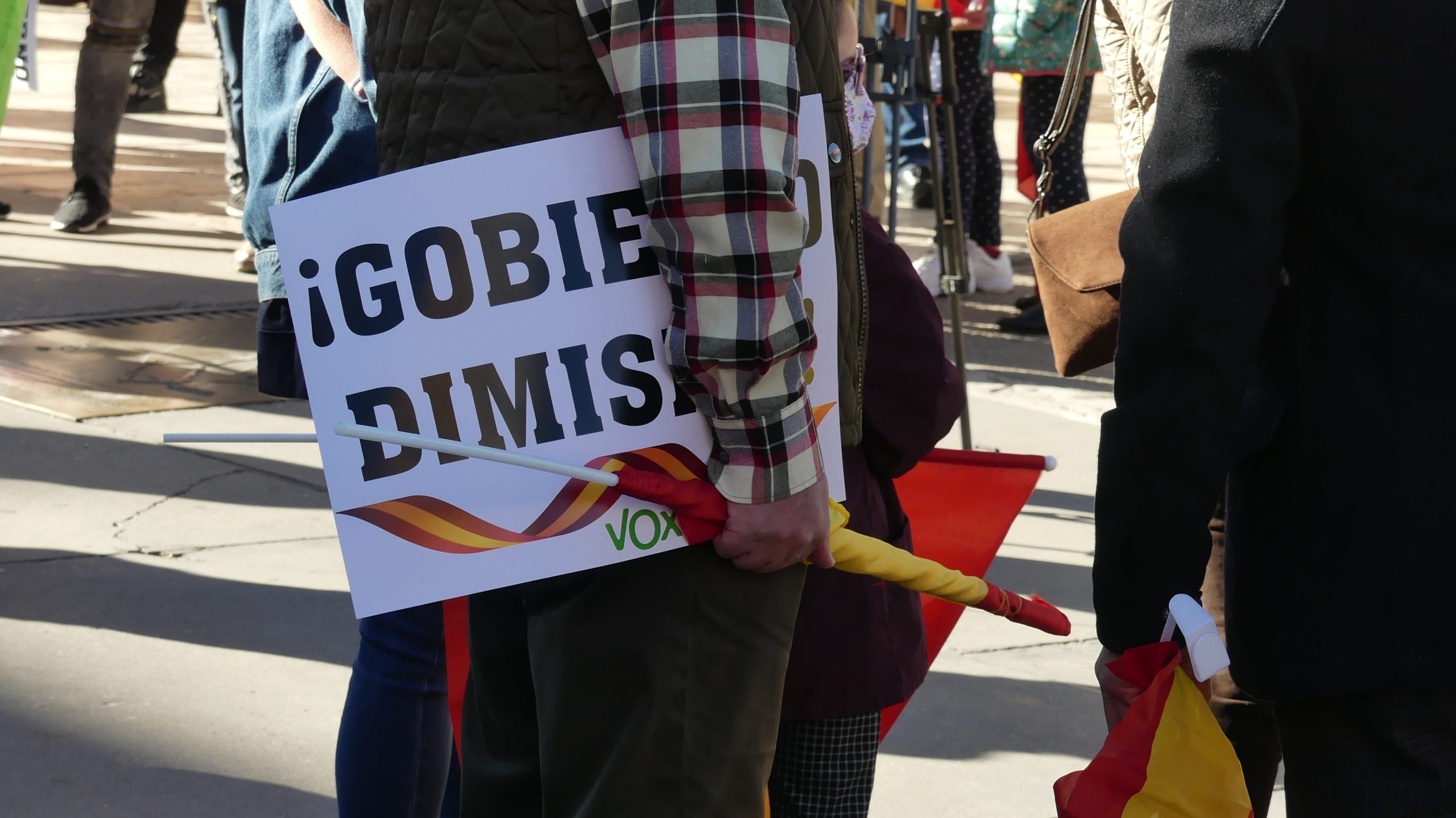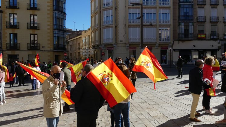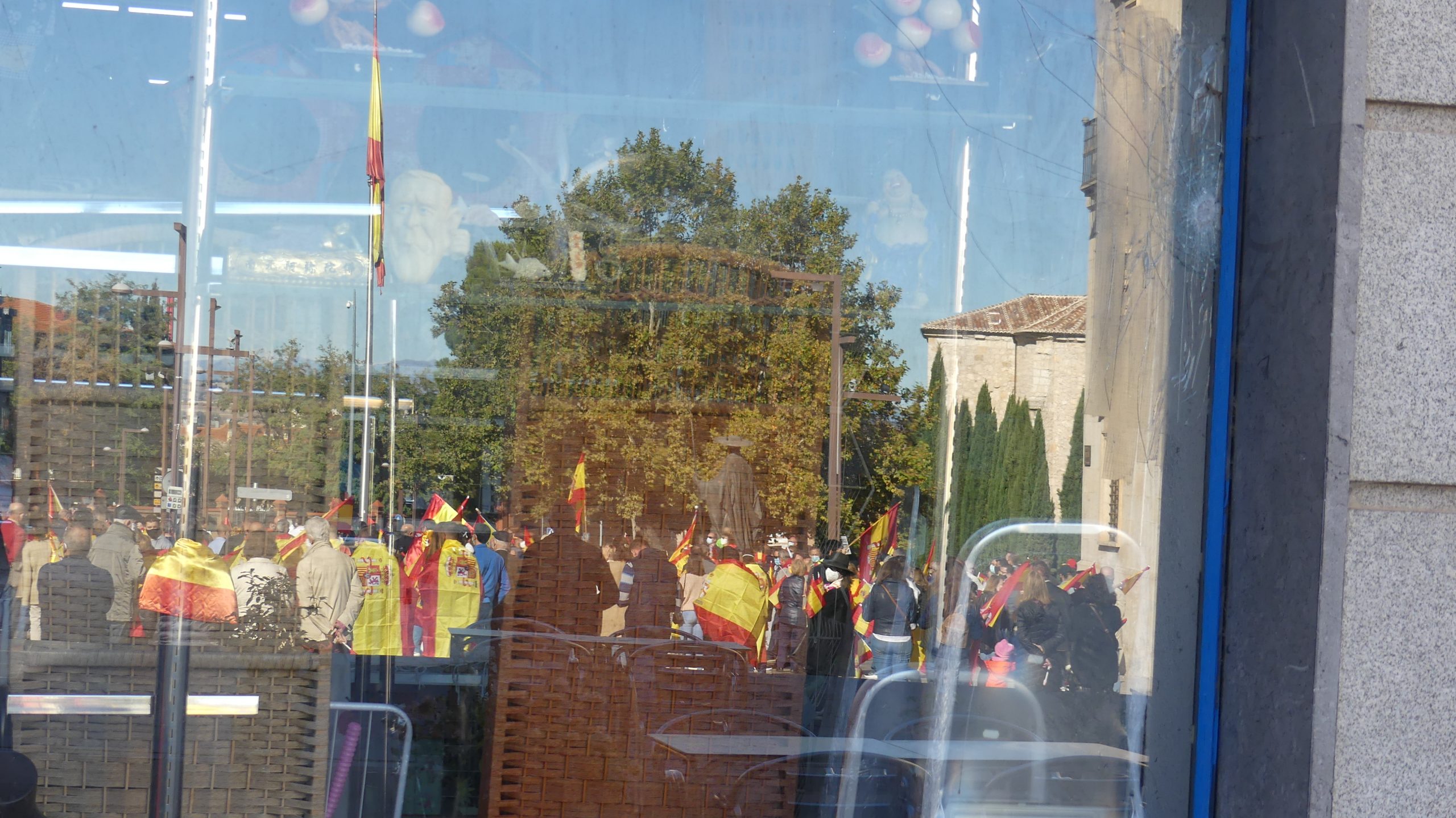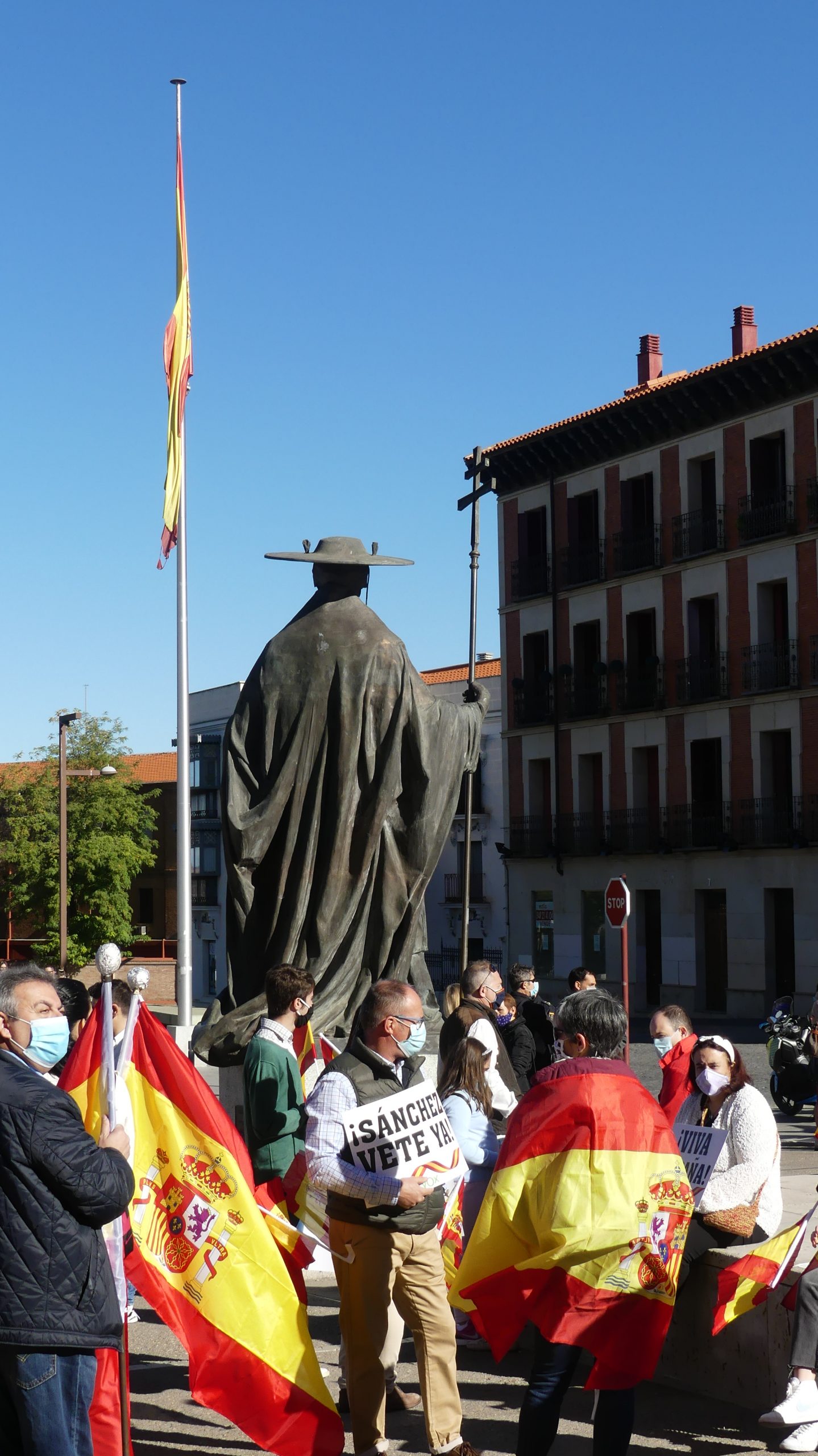 En la Plaza de España, a la sombra del Infantado apenas se aguantaba el frío de la mañana. Por eso, los que se iban reuniendo lo hacían al sol, que se agradecía. Con el paso de los minutos, junto con las banderas se dejaban ver cartelitos contra Pedro Sánchez y a favor de Felipe VI. Nada que no fuera previsible. Con media hora de retraso, los reunidos iniciaron la marcha.