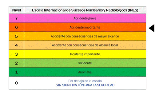 Un suceso de esta naturaleza habría sido clasificado inicialmente como nivel 6 en la Escala internacional de sucesos nucleares y radiológicos (INES),