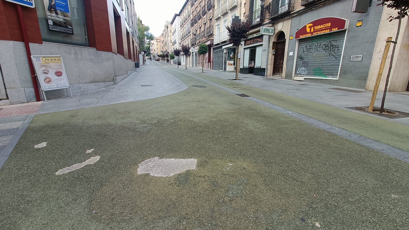Desde los primeros días de 2023, la reforma de la calle Miguel Fluiters pasó a convertirse en algo muy presente para los vecinos de Guadalajara. Primero durante las obras, que duraron meses y no estuvieron libres de sorpresas; más tarde, a la vista del resultado, rabiosamente verde; después, ante la constatación casi inmediata de la nefasta elección del material para la calzada, un caucho que por su color trajo chanzas y preocupaciones por igual. Nueve meses después, el deterioro sigue avanzando.