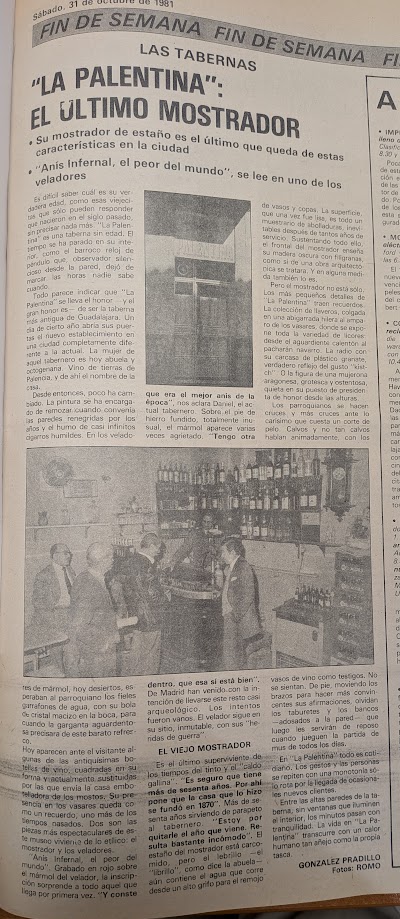 «Es difícil saber cuál es su verdadera edad, como esas viejecitas que sólo pueden responder que nacieron en el siglo pasado, sin precisar nada más. «La Palentina» es una taberna sin edad. El tiempo se ha parado en su interior, como el barroco reloj de péndulo que, observador silencioso desde la pared, dejó de marcar las horas nadie sabe cuándo.