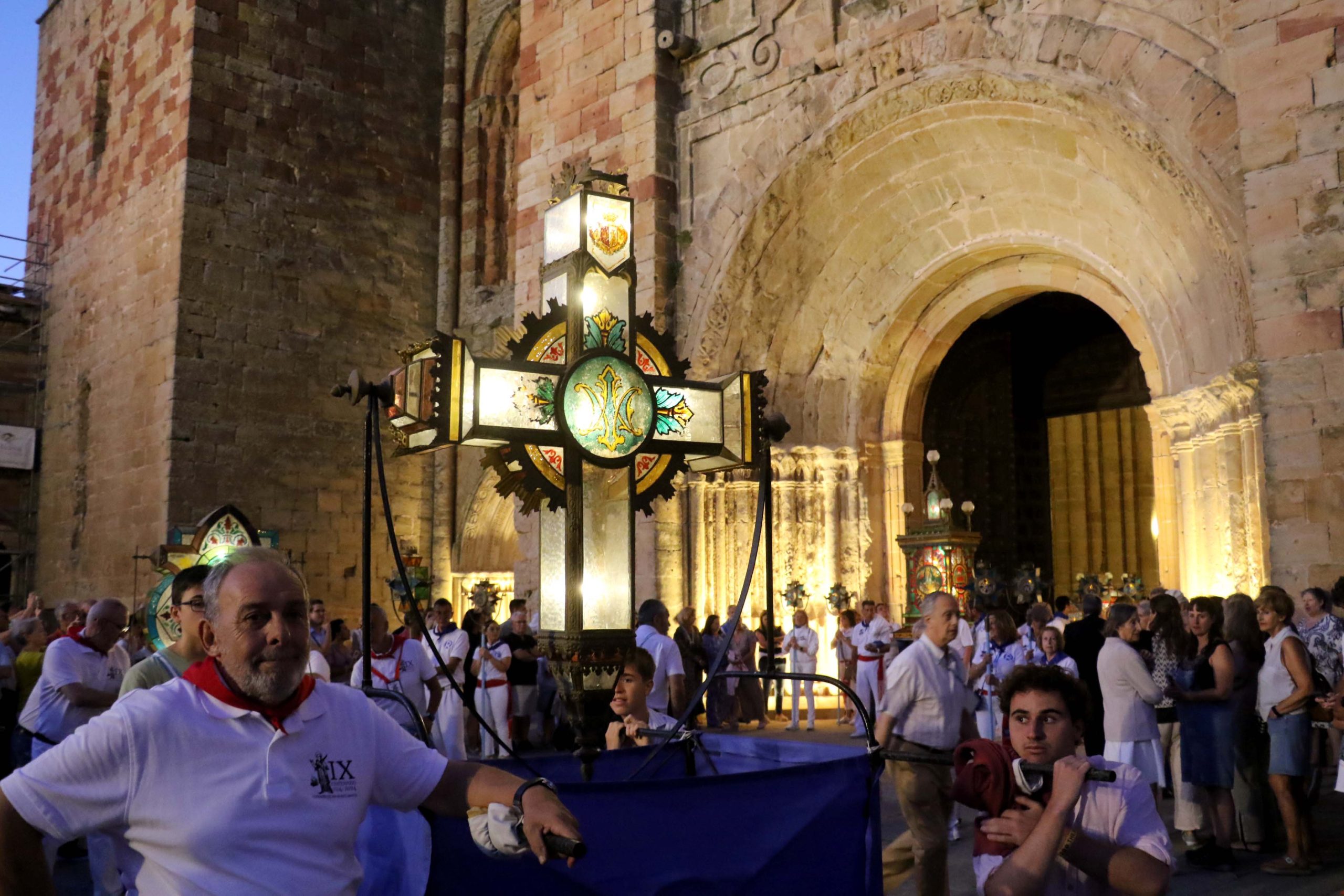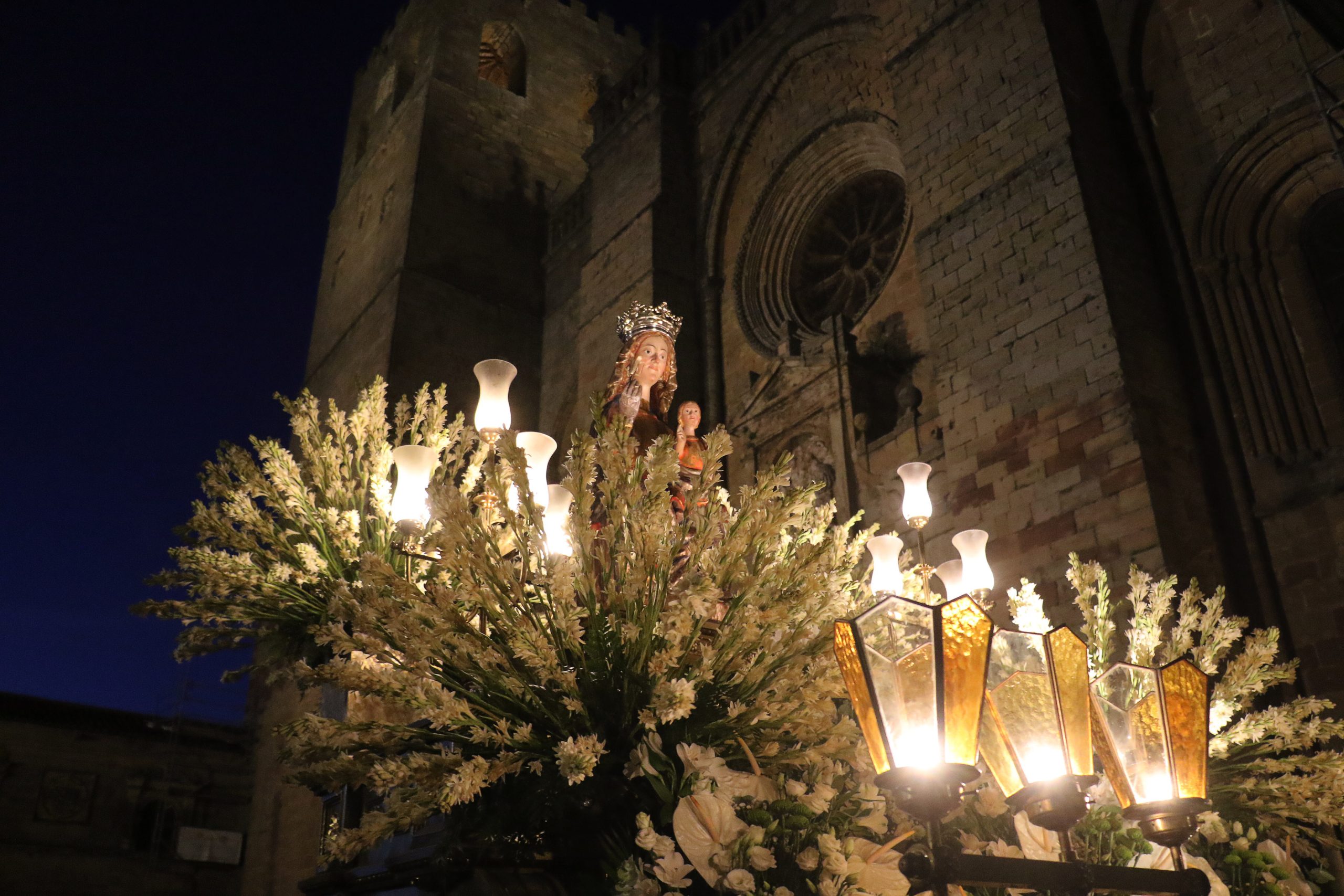 El tañido de las campanas catedralicias, el desgranar del Santo Rosario y los sones de la banda de música aportaban el sonido inconfundible de una de las más bellas noches seguntinas, iluminada por los cirios de los faroles procesionales y las luces artísticas y monumentales de la ciudad, mientras que los nardos, los gladiolos y las rosas en honor de la Virgen de la Mayor esparcían sus mejores olores y fragancias.