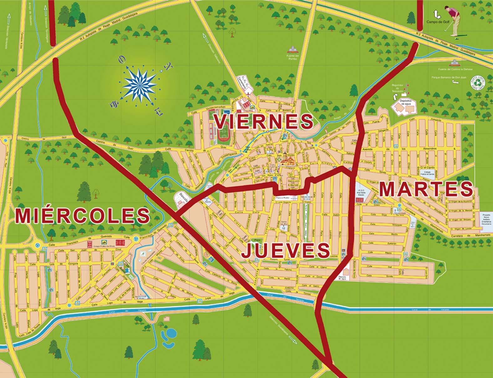 El servicio de recogida se ofrece sólo de lunes a viernes, y no en festivos ni en fines de semana. Se trabaja por zonas diferenciadas en función de los días de la semana: Los lunes se recogen restos del fin de semana en todo el municipio; los martes en la zona que queda al norte de la Avenida de Guadalajara, los miércoles en la zona al sur de la carretera CM-1007 (barrios de El Mirador y El Soto); los jueves en la zona centro-este de la localidad (delimitada por las calles San Sebastián, Mónaco, Miguel Hernández y Bruselas); y los viernes en el lado opuesto, la zona centro-oeste del municipio.