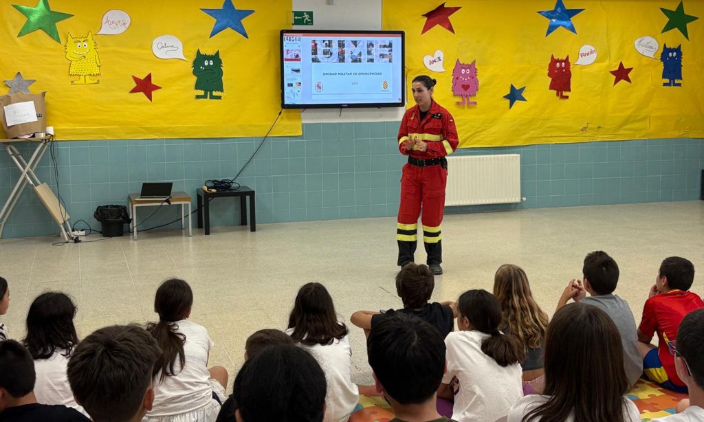 A esta visita de la UME acudieron, en representación del Ayuntamiento, los concejales Mario Valiente y Mari Carmen Martínez, quienes fueron recibidos por la directora del colegio, Tamara Biosca.